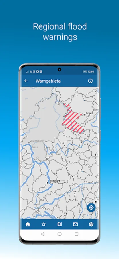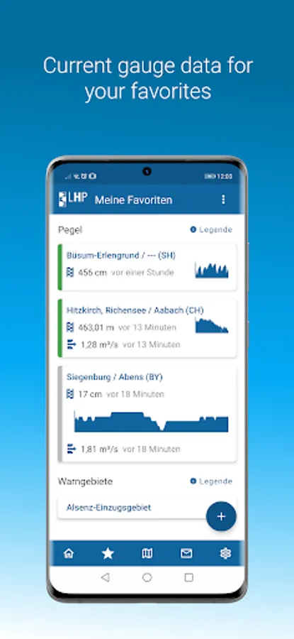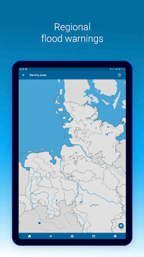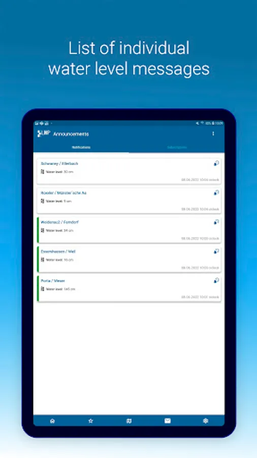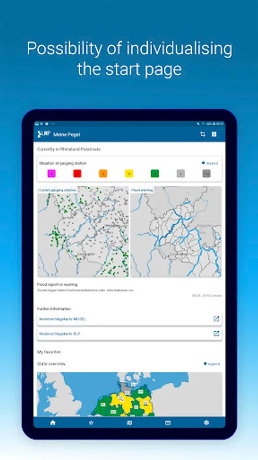 Functions: current water level, forecasts (where available), notification when water levels exceed/fall below limits, overview of the flood information and warning situation of the German federal states.