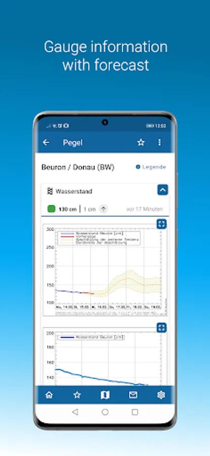- get informations about the current water level at your gauging station and be notified free of charge when the water level exceeds or falls below individually configurable thresholds (push notification)
