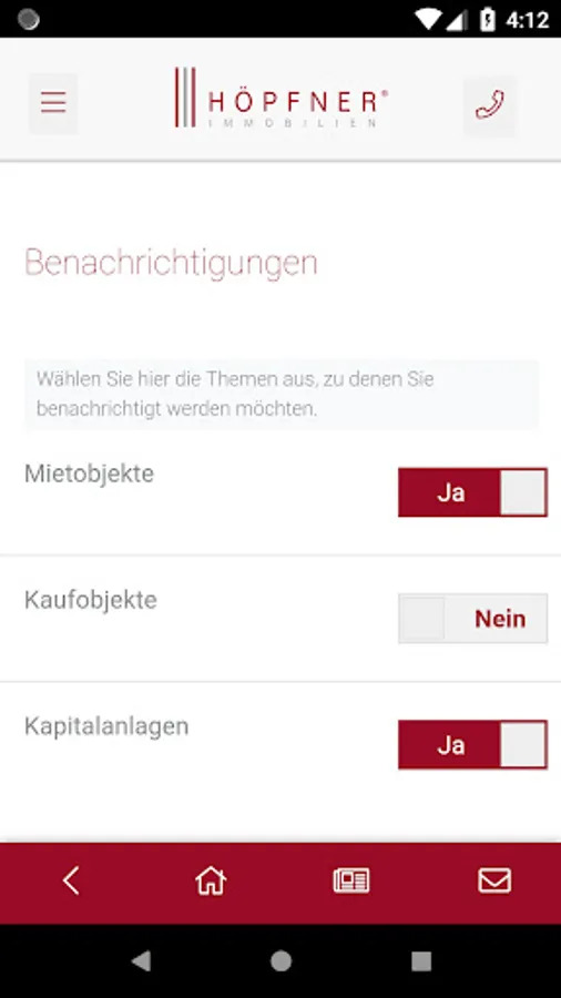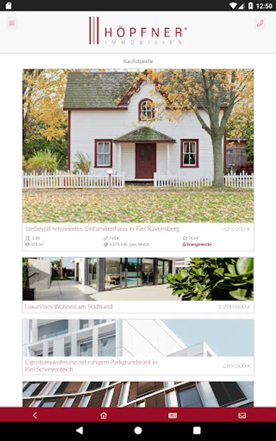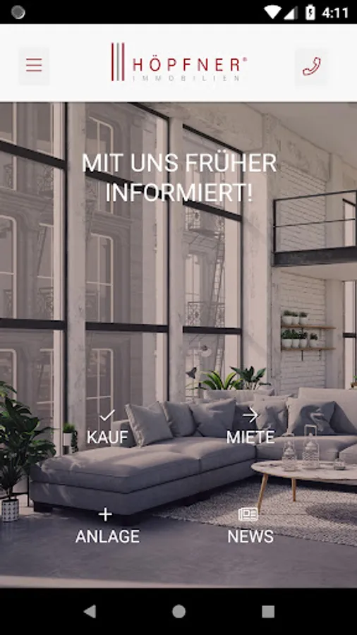 Also: You will find an information area with current topics to do with real estate, including an interest rate barometer for financing. So use the HÖPFNER APP – your new tool for your successful, quick and easy real estate search is free. You don't have to log in or register. No in-app purchases are required.