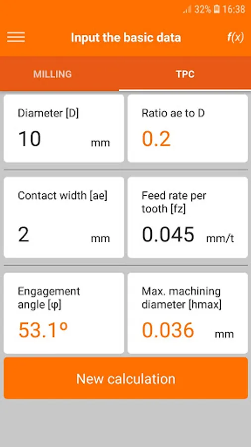 Calculate the relevant parameters for your application using a few entries. In this case, it is possible to calculate the cutting width, feed rate per cutting edge, cut arc angle and the maximum cutting thickness.