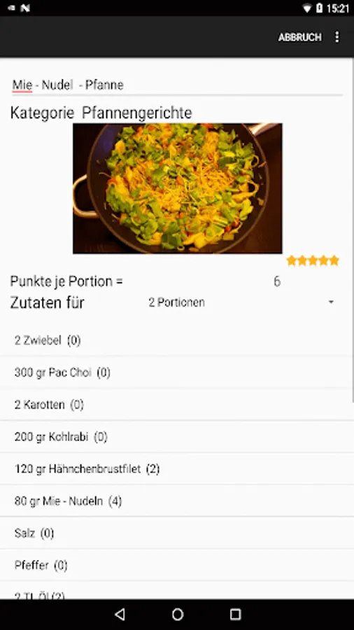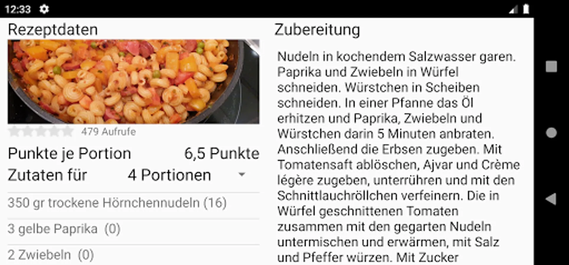 On the start page, you select the recipe by tapping it and you go directly to the recipe page, on which all ingredients and the preparation of the recipe are displayed.