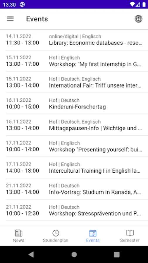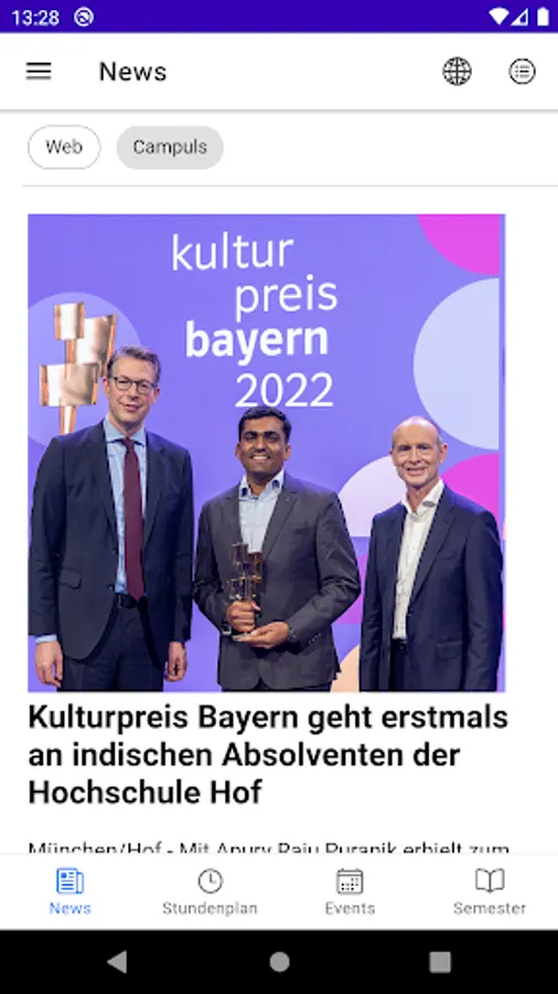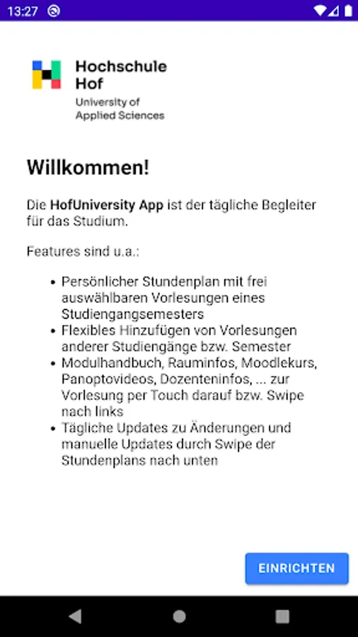 The HofUniversity app is multilingual and also offers a dark mode. One automatically receives notifications about new university news, campuls news, events, timetable changes, etc. Various other features are also in the works.