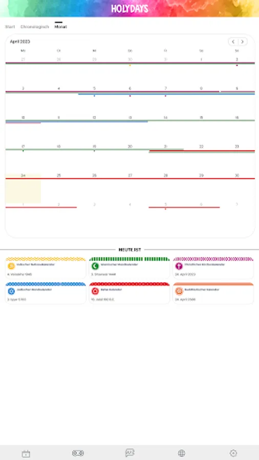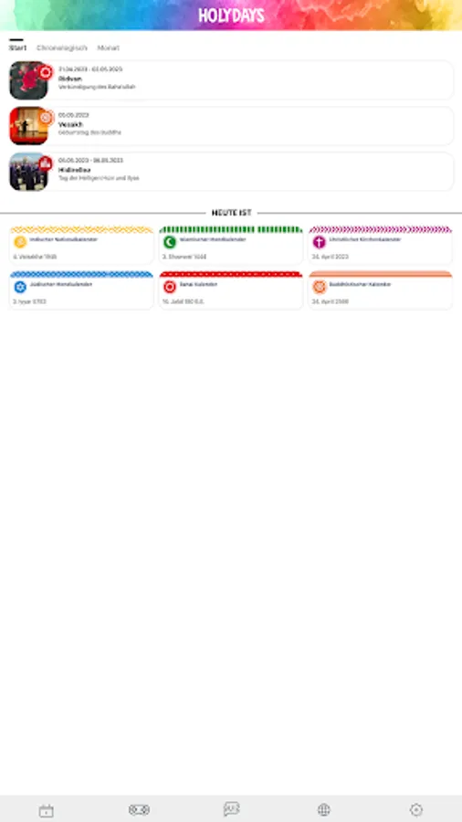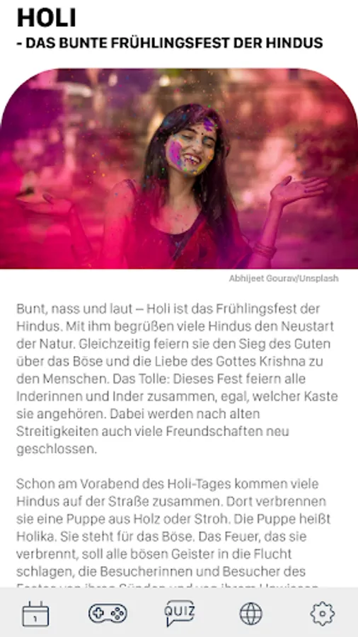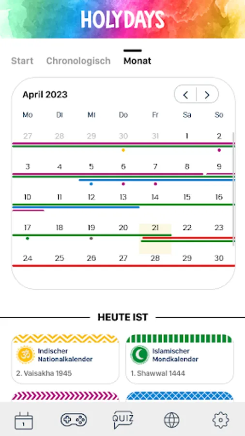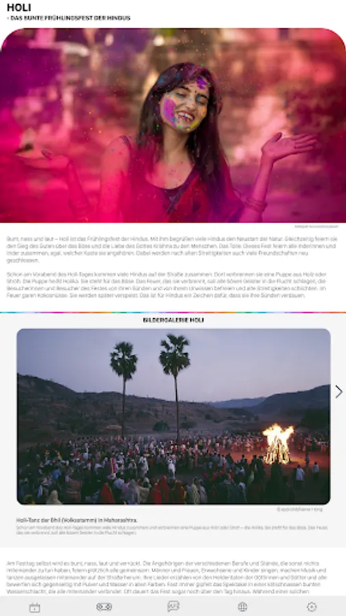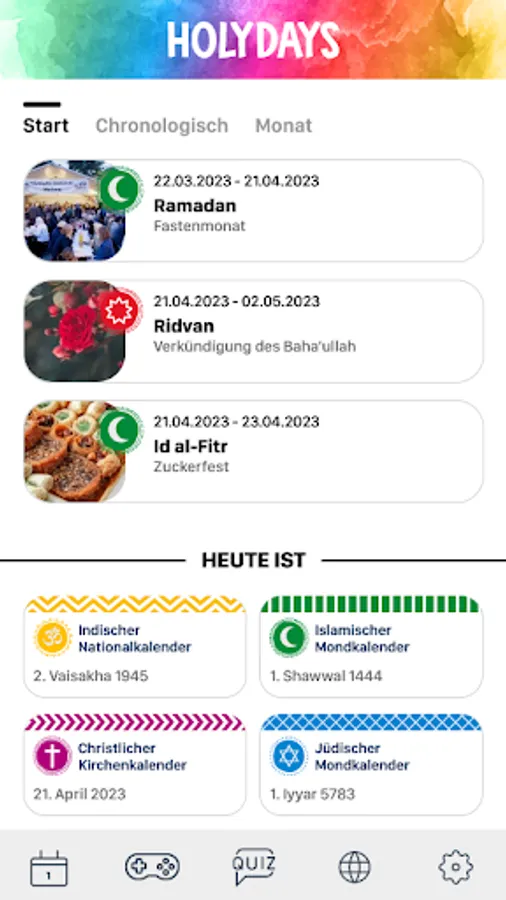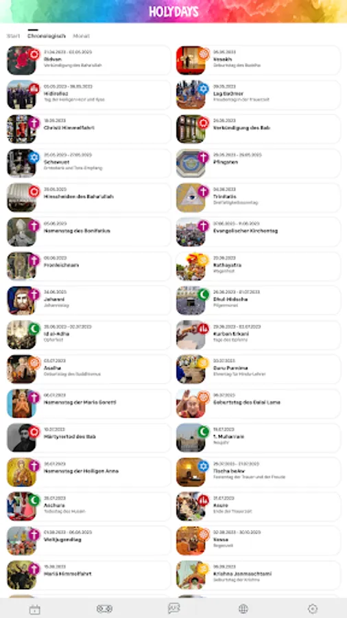 HolyDays is the festival and holiday app from religionen-discoveren.de, the award-winning children's site. Explore the religious festivals and holidays of the eight world religions: Alevism, Baha'i, Buddhism, Christianity, Hinduism, Islam, Yazididom and Judaism with exciting encyclopedia entries, picture galleries, videos and more. Immerse yourself in the world of religions and let yourself be individually informed about upcoming festivals and holidays.