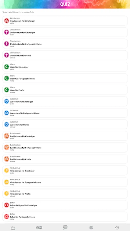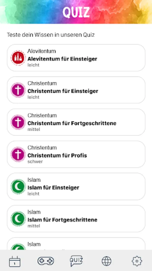 There are also exciting quizzes with different levels of difficulty that you can use to test your knowledge of religions. You can discover things in a playful way and express your own opinion about religions in our games.