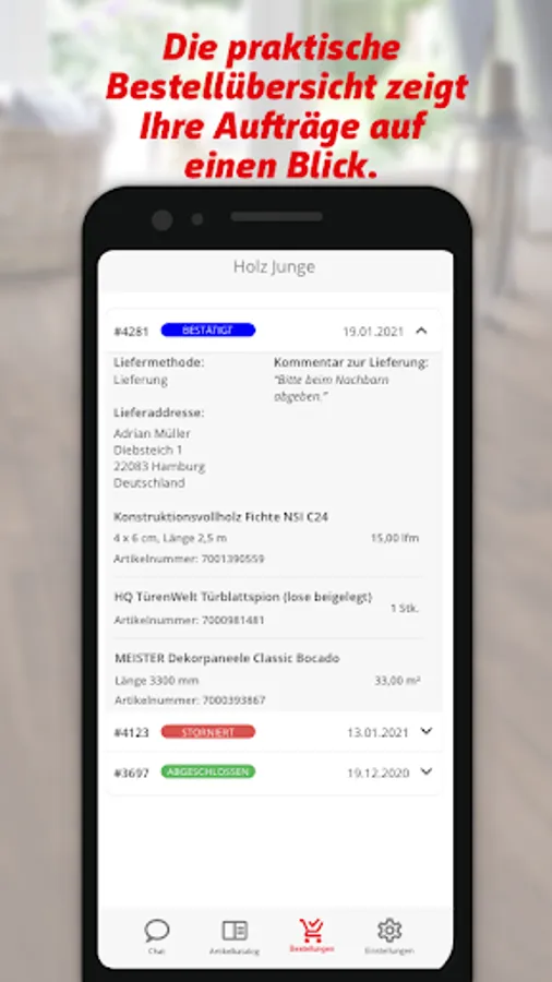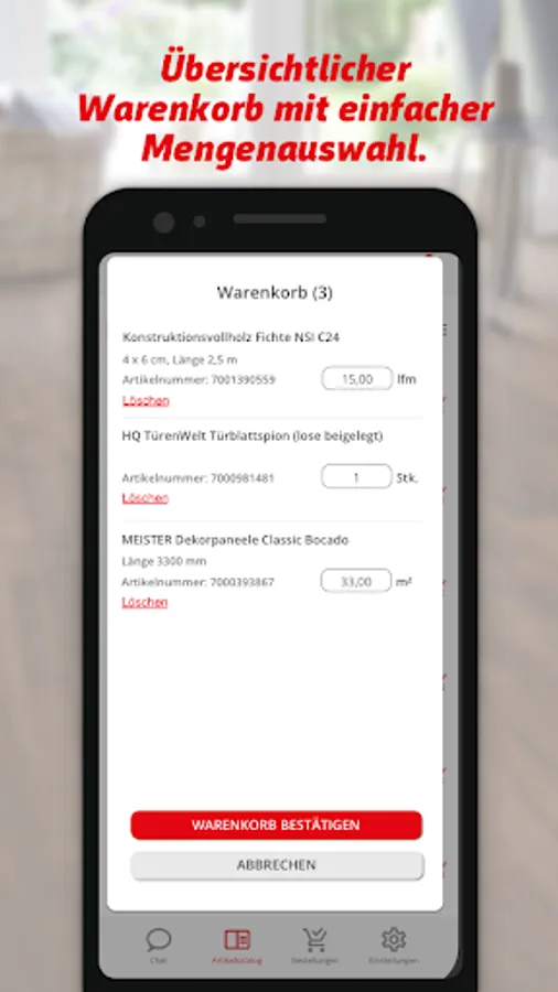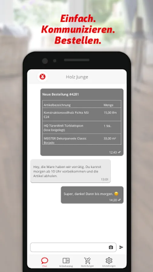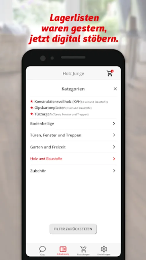 With the Holz Junge app, you can conveniently buy the goods you need via smartphone, regardless of location, and contact your specialist dealer at any time.