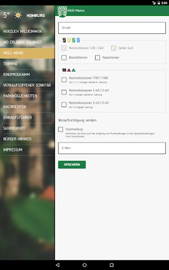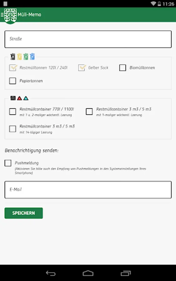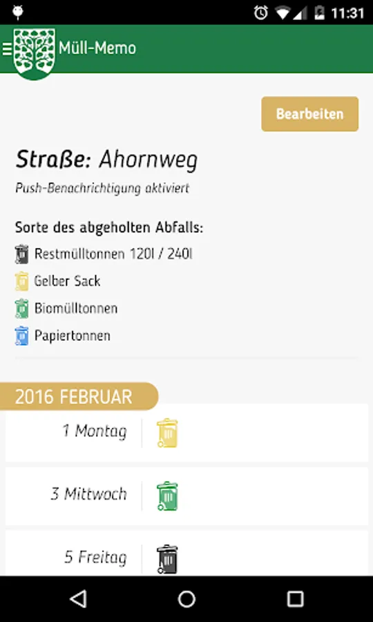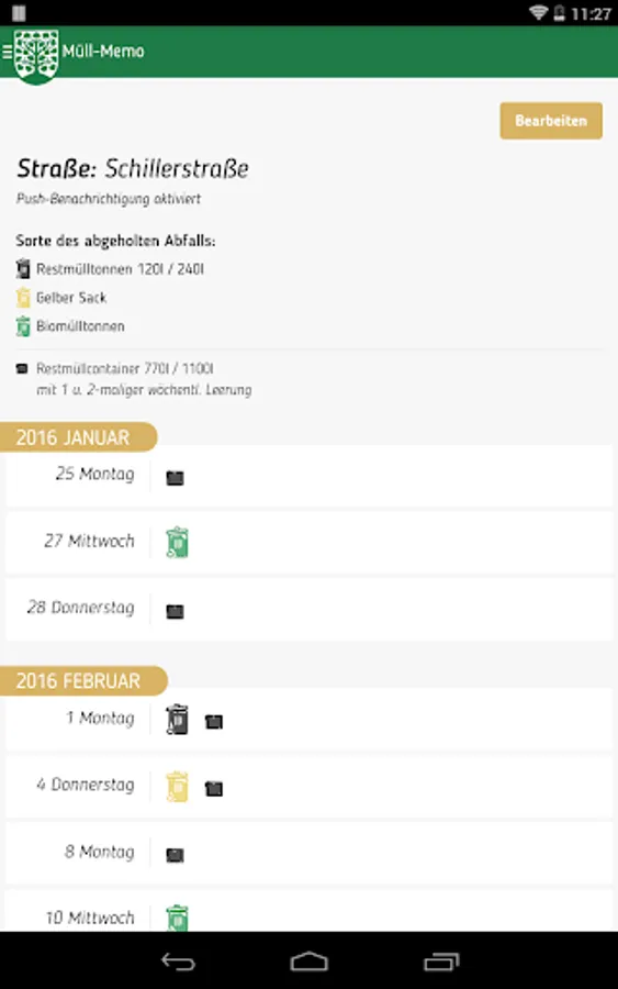 Stop the constant search for the waste calendar: Thanks to the simple and clear "garbage memo" function, you can receive the latest appointments to pick up your garbage sleep comfortably at a glance - and as desired even as push notification on the home screen of your smartphone or tablet or as an email.