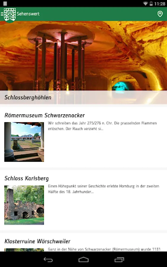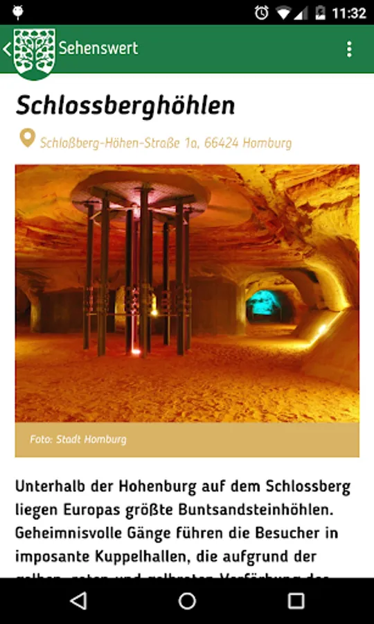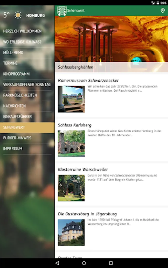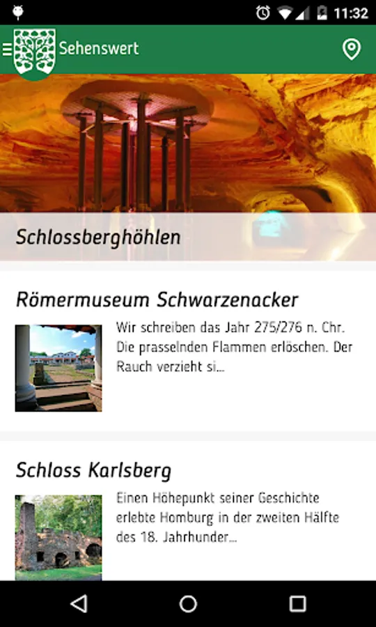 In Homburg at numerous points the testimony of a 2000-year history. Thanks to the function "Interesting" there are all the tourist attractions with appropriate images and all information about the Schlossberg caves, the Roman Museum and many other tour destinations.