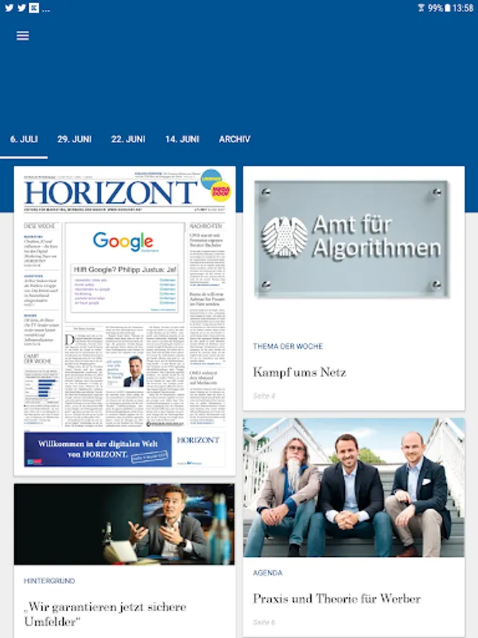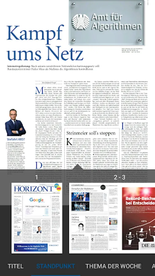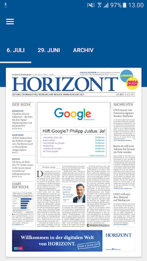 With the HORIZON E-Paper app is available every Wednesday from 17.00, the entire contents of the print edition - supplemented by additional spots in the campaign ticker - available for download.