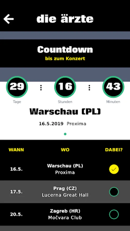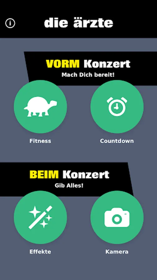 Concerts Äpp helps you to prepare for all eventualities and is also an indispensable multitool for a successful concert full of interaction between you and your favorite band. Use the exclusive camera feature to make the best concert experience even better! And let's see in real time, how long it's going to be until your personal concert experience with the doctors. Because live is liver!