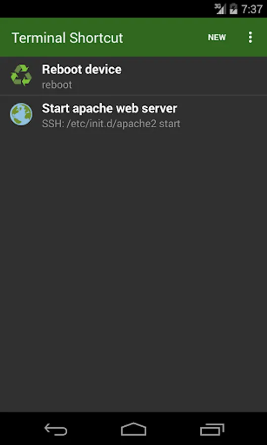 Some terminal commands have to be executed multiple times. If you do this in a terminal emulator, you need to type in the command by hand. With this app you can set a link (shortcut) to any terminal command which can be executed afterwards by pressing a button. If the command generates an output, it can easily be displayed if needed. Remote commands can be executed by using SSH. Commands can use SuperUser privileges.