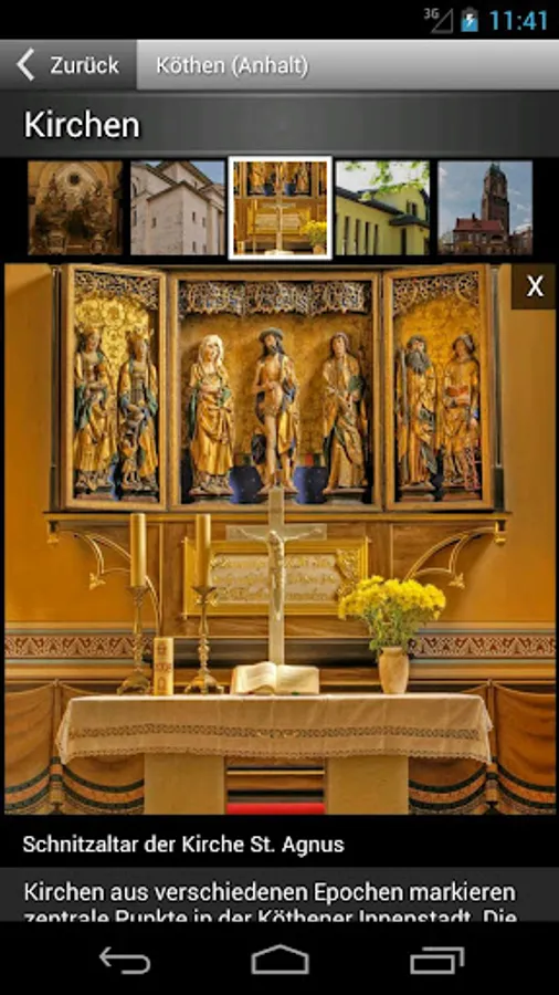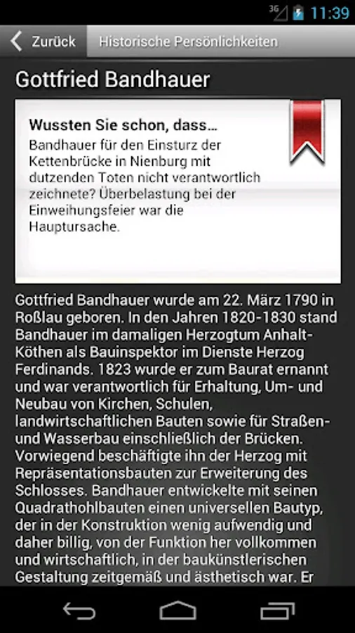 So, the app offers a virtual city tour, which includes a lot of information about various attractions. In addition to information about the local history there is also plenty of interesting things to learn about historically significant personalities who once lived in Köthen and worked, including the composer Johann Sebastian Bach or the founder of modern homeopathy, Samuel Hahnemann. In addition, the app provides information on various leisure activities has to offer Köthen. Surprising and strange things from earlier times experienced by the app users via small anecdotes which will be displayed when clicking a red bookmark. Also pictures gallery and a map on which the city's sights are located, are available.