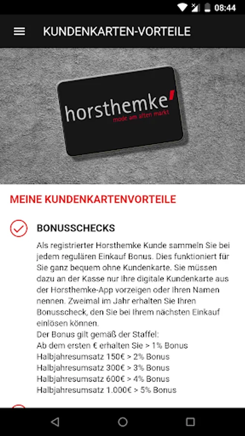 Brand new: With each of your purchases from us, you collect for your bonus check, which is sent to you semi-annually directly in the app via push message and can be redeemed on site. You will also receive vouchers for € coupons, discounts, shopping benefits, give-aways and small gifts.