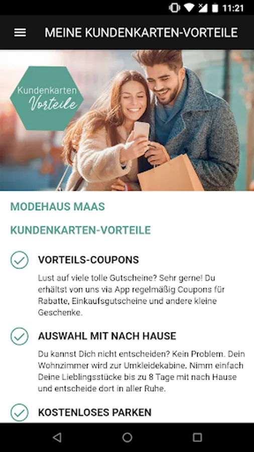 With the Maas app from the fashion house Maas you have all the advantages right on your smartphone! You regularly receive your personal benefits directly via push message.