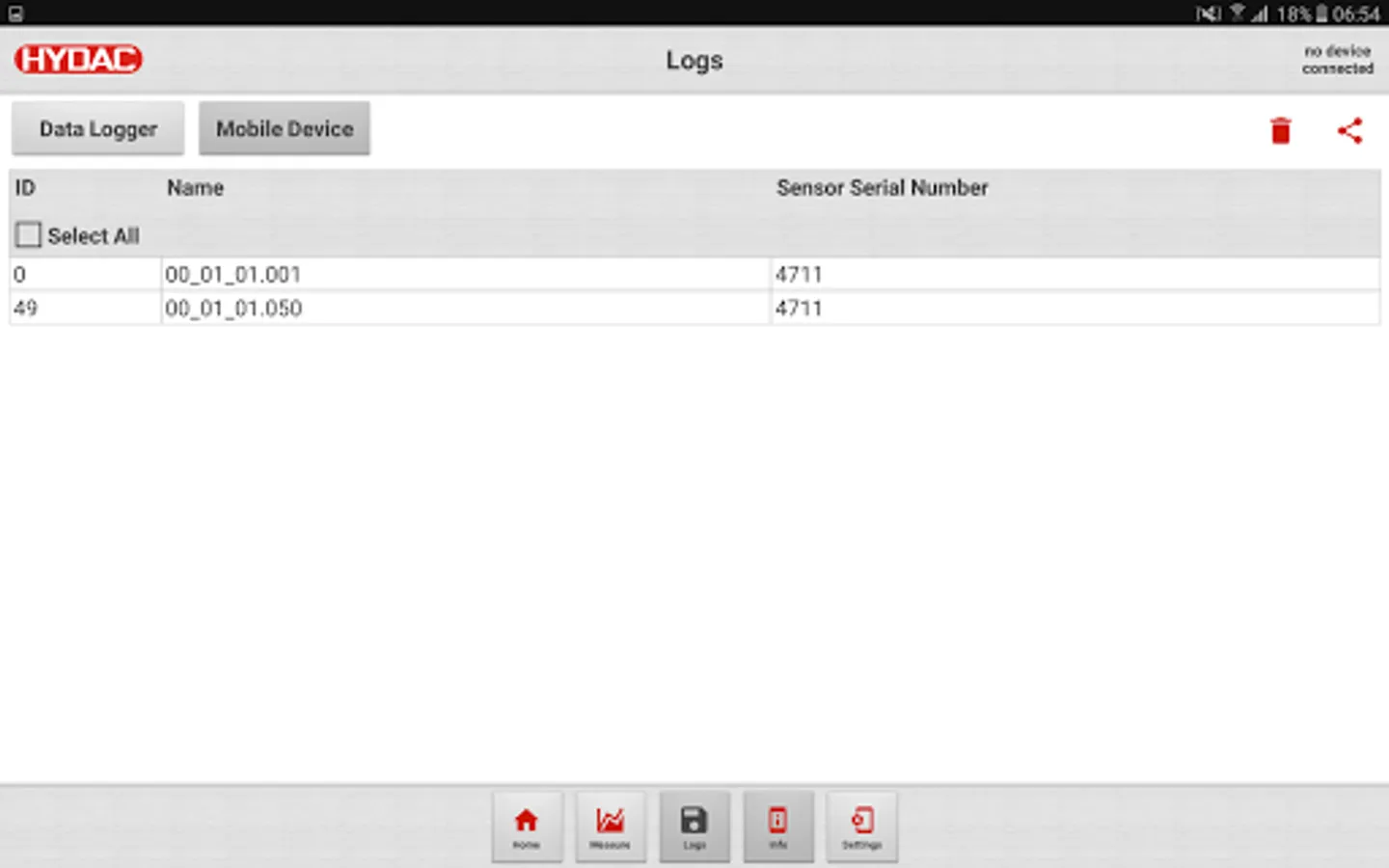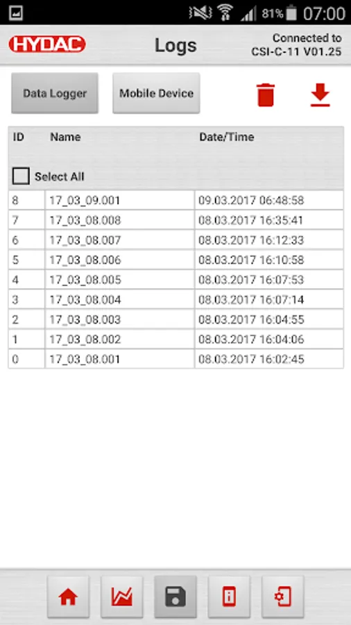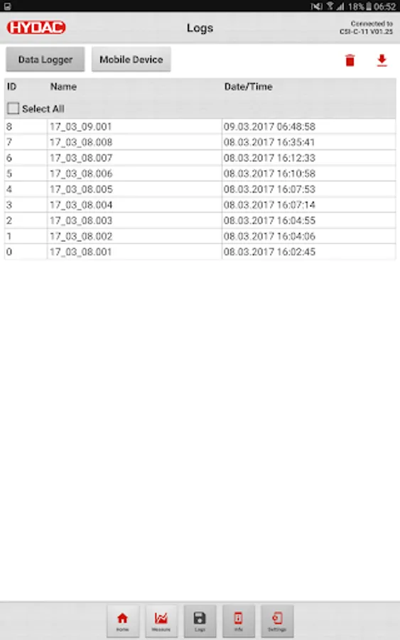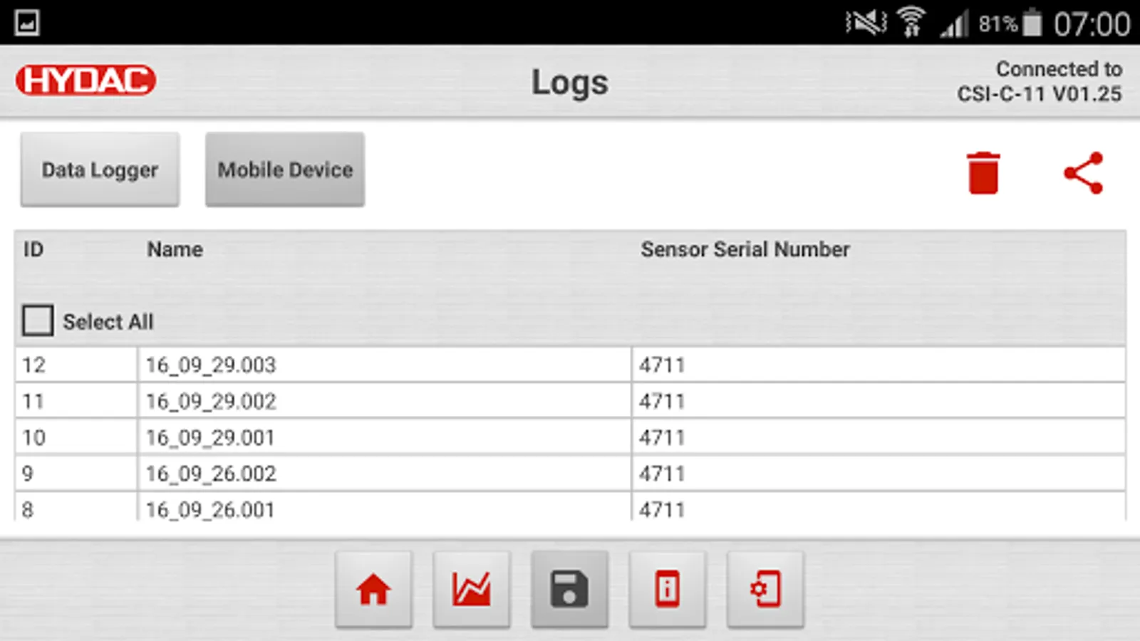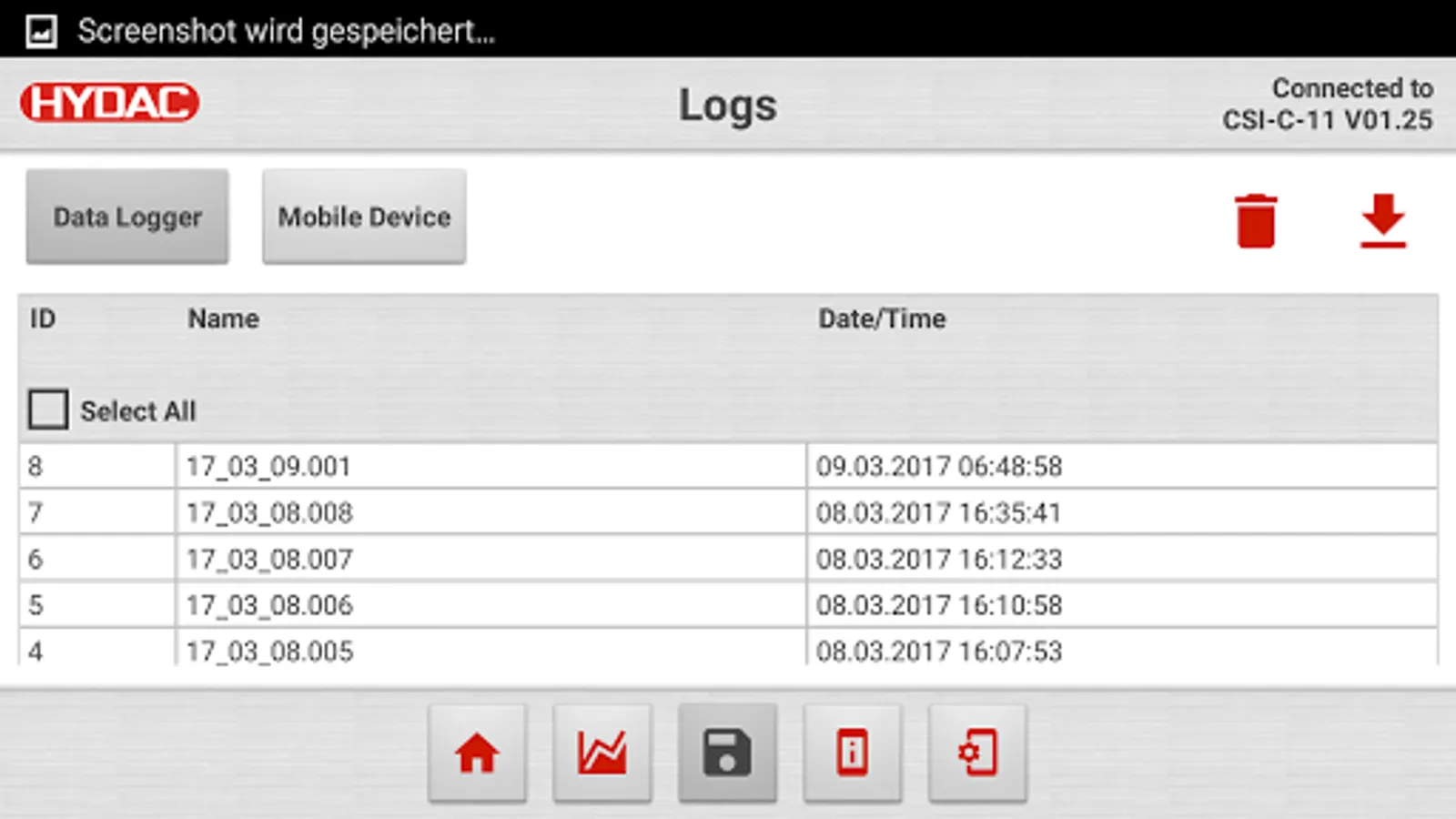 - Selective download of log files in .dat format from the internal memory of the FCU 1000, SMU 1200 or CSI-C-11 to your Android device