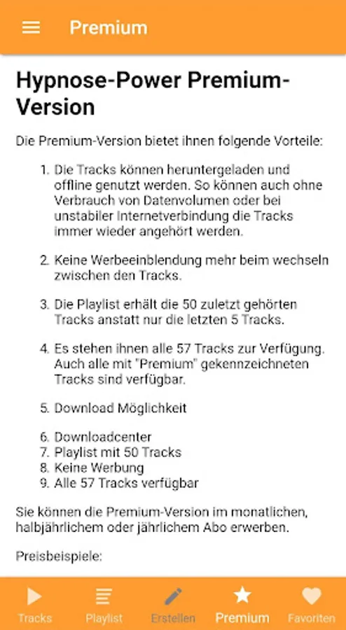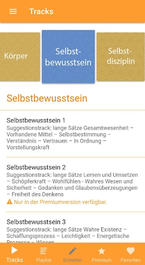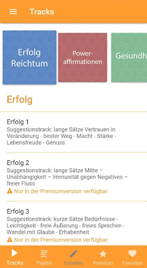 57 tracks from 16 categories guide you through the different layers of your consciousness. Most tracks are available as day and night versions (without a wake-up phase). Proven effective suggestions help you directly and indirectly to realign yourself, create yourself and change your life positively. All tracks are underlaid with isochronous tones (see FAQ in the app), which means that almost everyone can automatically get into the desired trance state.