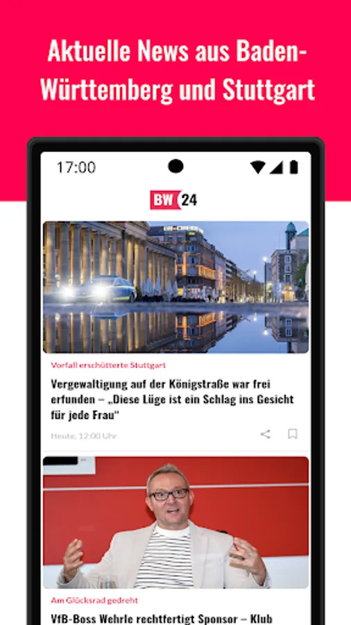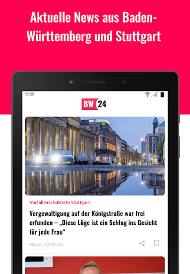 Current news from Baden-Württemberg: With the BW24 app you can always stay up to date on everything important from Stuttgart, politics and business in the region as well as Europa-Park, VfB Stuttgart and the weather in the Ländle.
