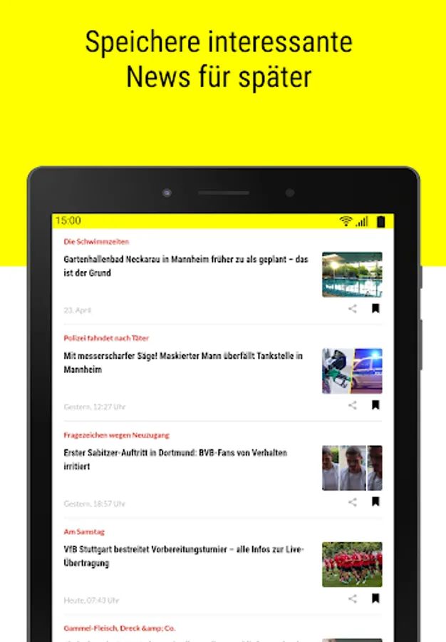 With the optional push message function, you will be notified of all the latest news. In addition, you can now save interesting reports using the bookmark function and access them later in your watch list, as well as share all articles with your friends.