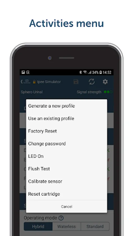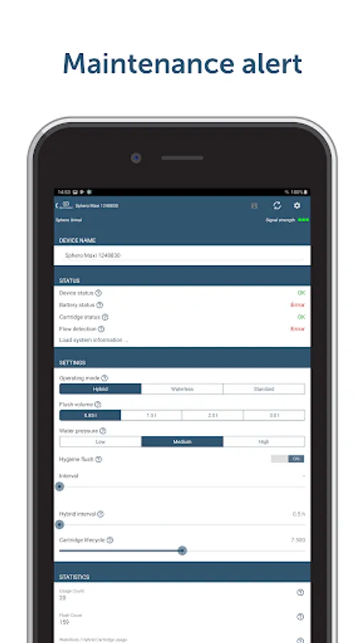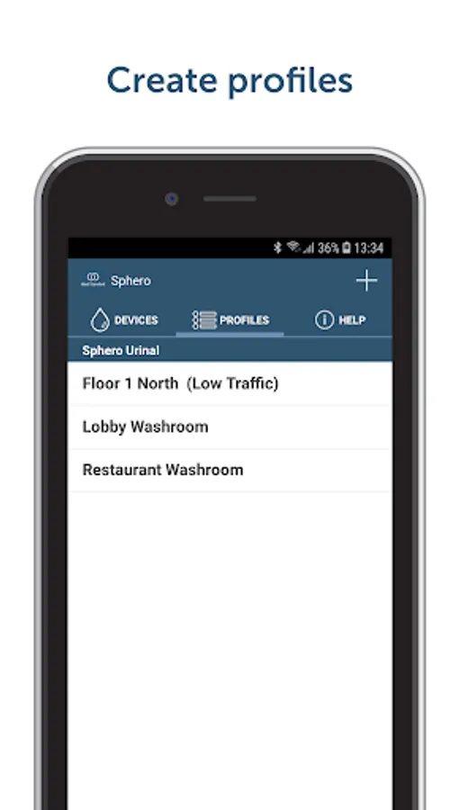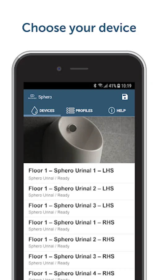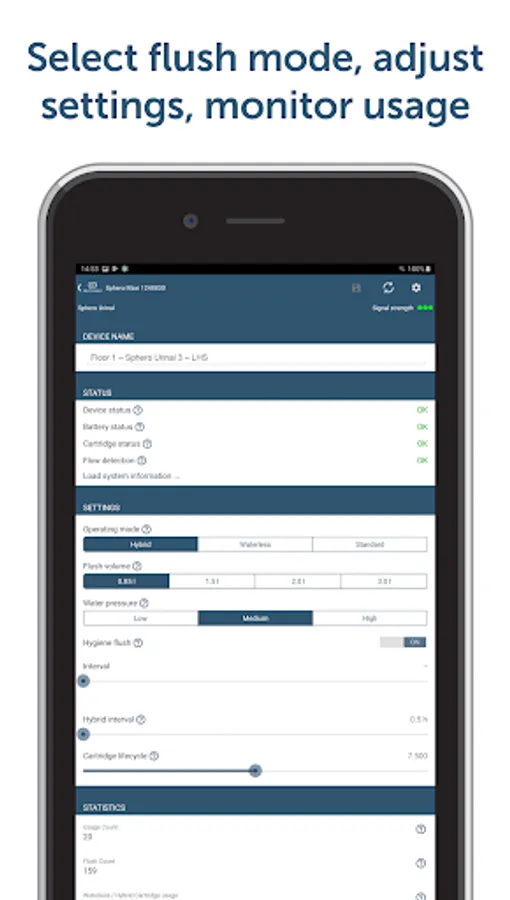 With Ideal Standard’s Smart Sensor App you can conveniently operate your Sphero Smart Hybrid urinals via mobile phone or tablet. The app allows operators to choose between three different flush modes: Hybrid, Standard and Waterless. Default settings like flush volume, interval and hygiene flush programming can be modified to the user’s specific needs. It is even possible to create different profiles for settings that can then be applied to a whole group of urinals. Furthermore, you will automatically receive a maintenance alert should there be flow issues, blockages or if the battery or cartridge need replacing. The app also allows you to monitor usage and that data can then be exported for further diagnostic.