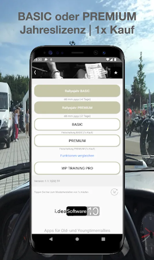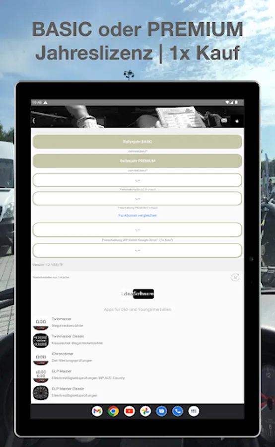 *Activate Basic or Premium feature optionally as yearly subscription or one time in-app purchase . A subscription renews automatically. It can be canceled at any time in the Play Store. Learn more, visit Terms of use https://play.google.com/about/play-terms/ and Privacy https://www.ideasoftware-apps.de/Kontakt for more info.