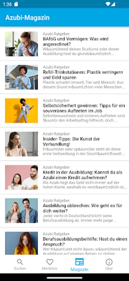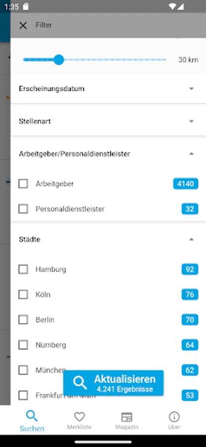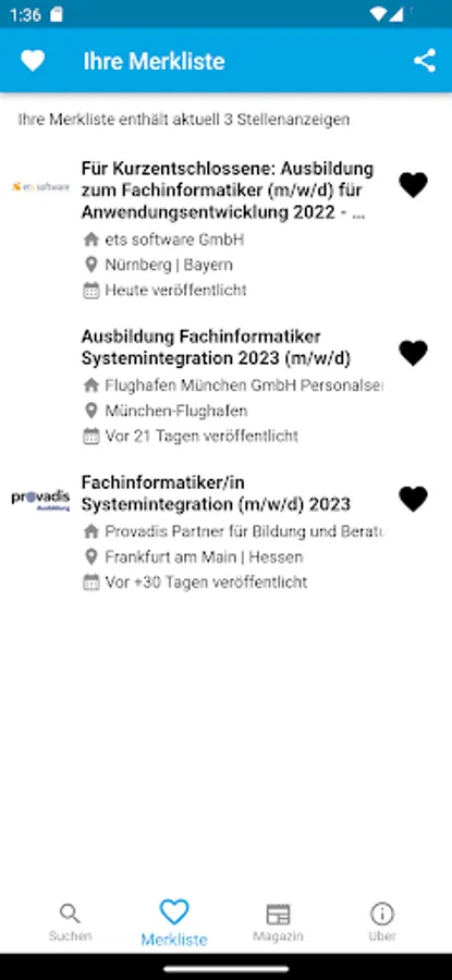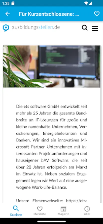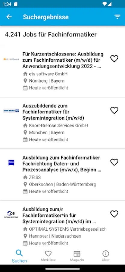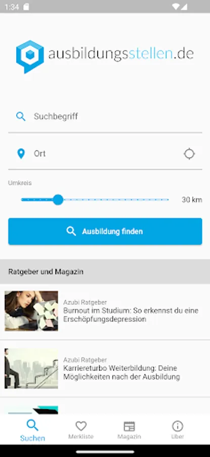 With the search for an apprenticeship in the ausbildungsstellen.de app you'll find fast training places in your region. Our simple and effective search takes into account more than 80,000 trainee places * from over 200 different career portals and corporate sites. By associated with the location-aware, dynamic area search you can apprenticeships in the area quickly. Use the built-in filter functions to your training places to be specified. By Exclude from employment agencies and temporary employment agencies, taking into account selected cities or employers, and the targeted search to selected career portals you quickly find the appropriate apprenticeship.