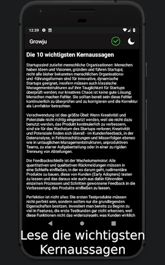 Growju offers you an efficient method of acquiring the knowledge in the shortest possible time or consolidating what you have learned from the books. We summarize the most important books for you and generate audio books from them. Together with our "cheat-sheet", which includes the ten most important key messages and with the help of a quiz, Growju offers an optimal learning experience for founders and the self-employed and those who still want to become one.
