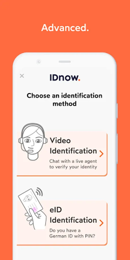 IDnow eID: Where applicable, you may have the option to quickly verify your identity via a German electronic ID card without the need for a video chat. All you need is an NFC-enabled smartphone that serves as a card-reader and securely transmits the encrypted data of your eID.