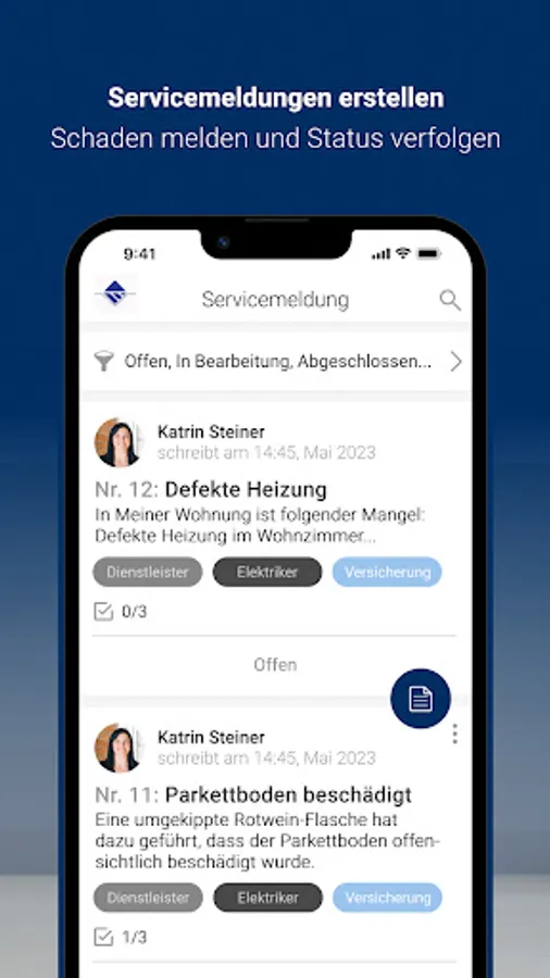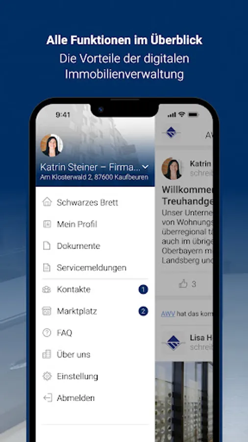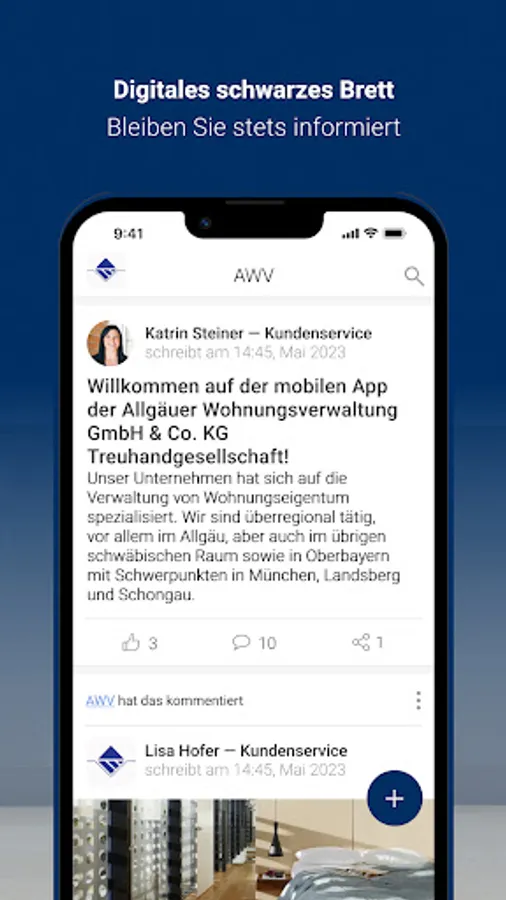 As a customer of Allgäuer Wohnungsverwaltung GmbH & Co. KG Treuhandgesellschaft, you benefit from a particularly innovative customer service that offers you a great deal of freedom. With the AWV app, you can report concerns and damage to us around the clock, including photo documentation, via smartphone. In addition, we provide you with a digital document folder with important documents for your property(s). We use the digital bulletin board to proactively provide push notifications about important information about the properties entrusted to us.