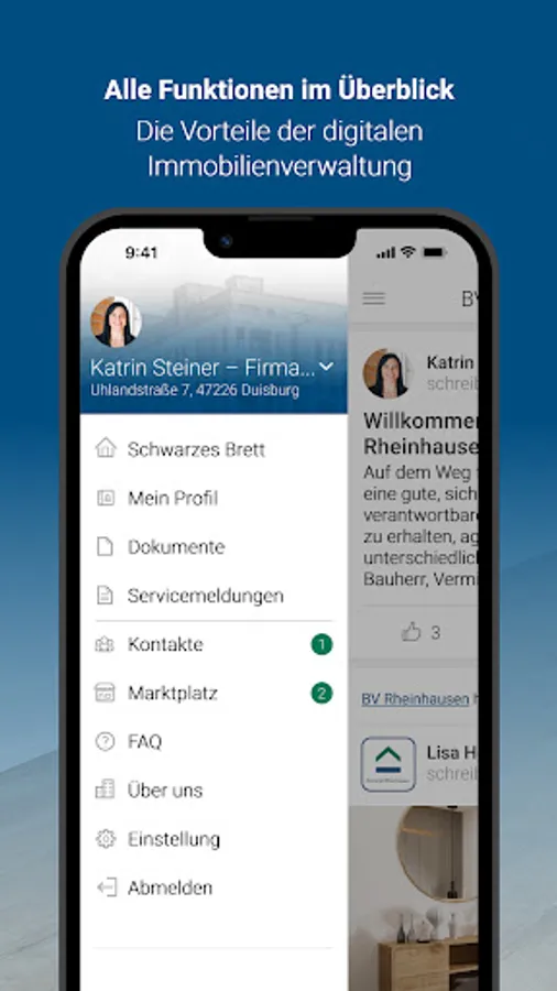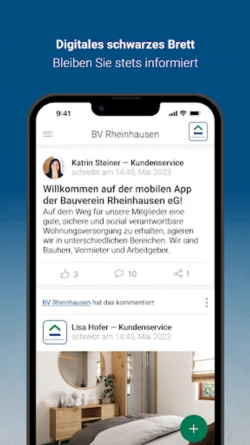 - Transparent: For us, documentation is “half the battle”. With the BV Rheinhausen app you receive all important information about your property directly on the bulletin board and can comment on it.
