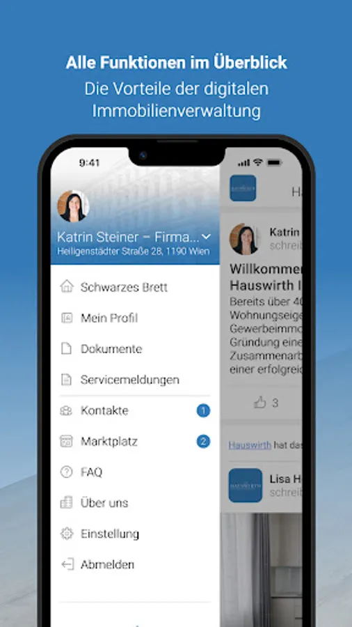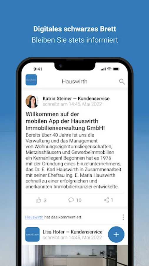 As a customer of Hauswirth Immobilienverwaltung GmbH, you benefit from a particularly innovative customer service that offers you a great deal of freedom. With the Hauswirth app, you can report concerns and damage to us around the clock, including photo documentation, via smartphone. In addition, we provide you with digital information. We use the digital bulletin board to proactively provide push notifications about important information about the properties entrusted to us.