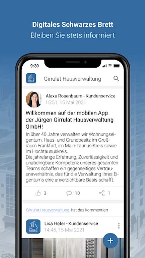 As a customer of Jürgen Girrulat Hausverwaltung GmbH, you benefit from a particularly innovative customer service that offers you a lot of freedom. With the HV Girrulat app, you can report concerns and damage to us around the clock, including photo documentation, via smartphone. In addition, we provide you with a digital document folder with important documents for your property(s). We use the digital bulletin board to proactively provide push notifications about important information about the properties entrusted to us.