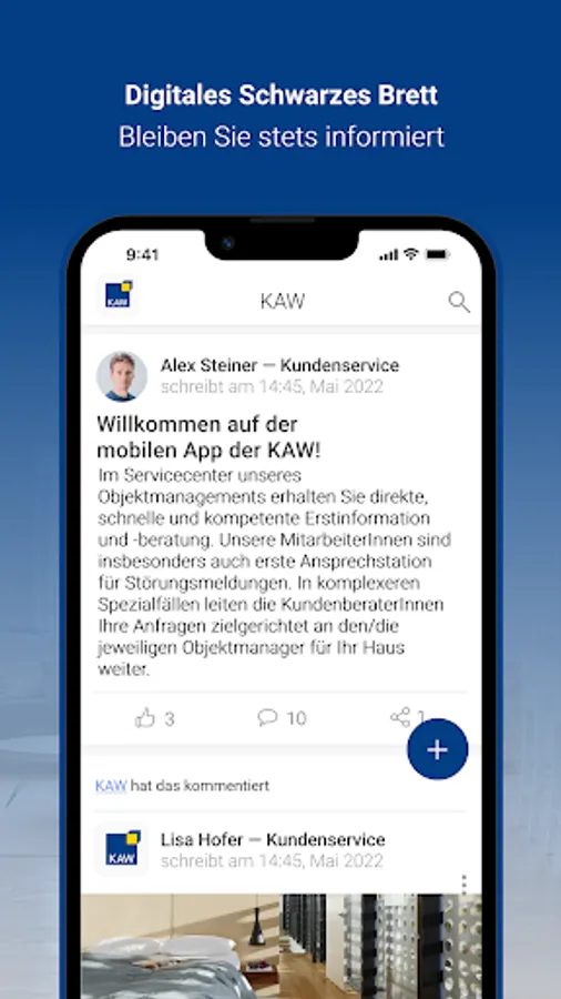 As a customer of the construction, housing and settlement company Kirchberg am Wagram, non-profit society m.b.H. benefit from a particularly innovative customer service that offers you a lot of freedom. With the KAW app, you can report concerns and damage to us around the clock, including photo documentation, via smartphone. In addition, we provide you with a digital document folder with important documents for your property(s). We use the digital bulletin board to proactively provide push notifications about important information about the properties entrusted to us.