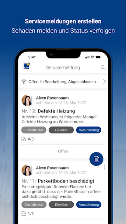 - Interactive: You can record damage reports or other concerns with photos directly in the KAW app. Your case will be processed quickly and you will receive regular status updates via push messages.