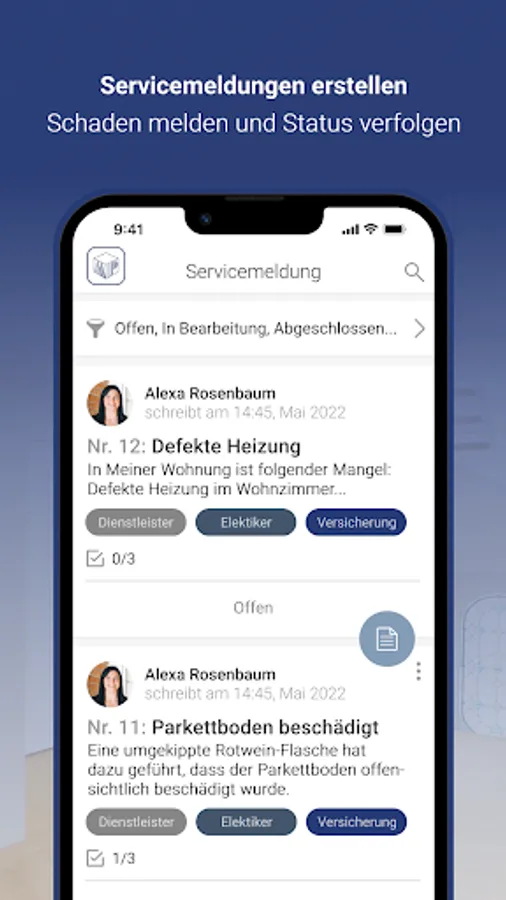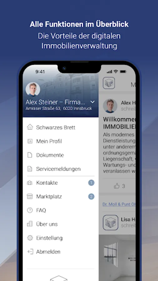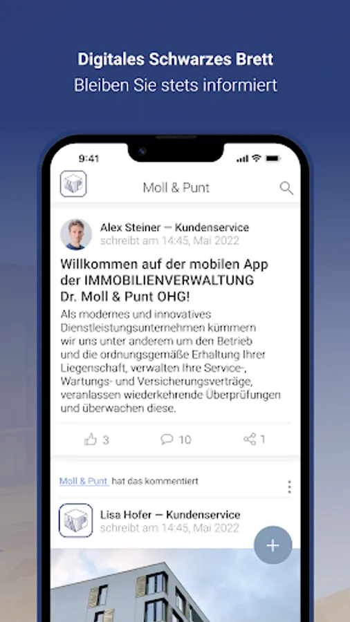 As a customer of REAL ESTATE MANAGEMENT Dr. Moll & Punt OHG you benefit from a particularly innovative customer service that offers you a lot of freedom. With the Moll & Punt app, you can report concerns and damage to us around the clock, including photo documentation, via smartphone. In addition, we provide you with a digital document folder with important documents for your property(s). We use the digital bulletin board to proactively provide push notifications about important information about the properties entrusted to us.