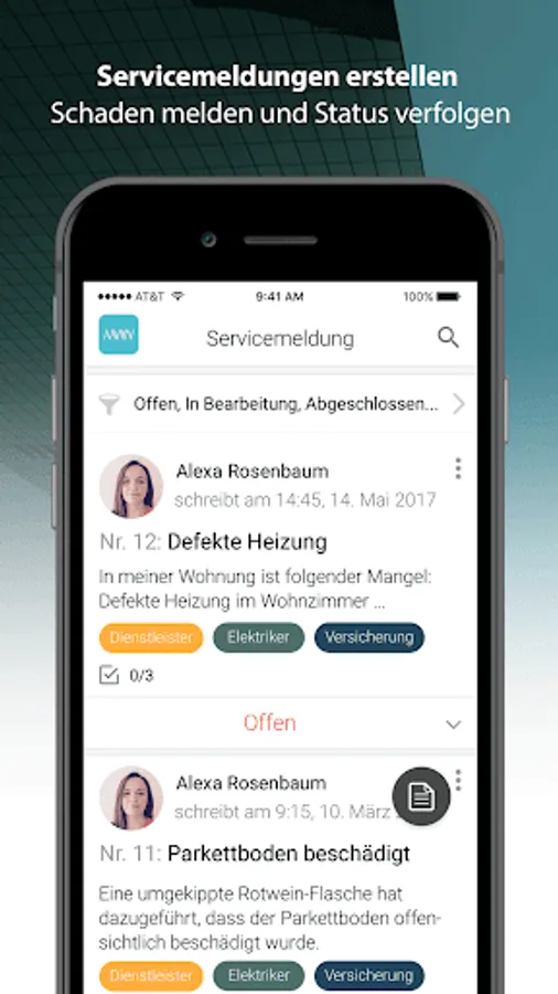Benefit from the MWW app and report your concerns and damage to us around the clock. You will receive status updates on your reports and all correspondence will be documented.