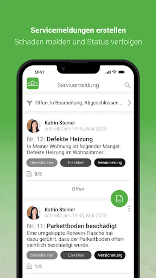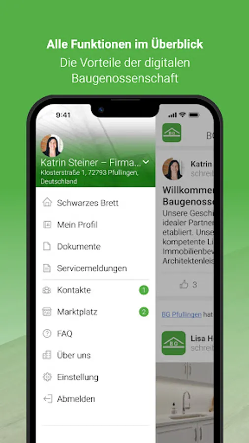 As a customer of the Baugenossenschaft Pfullingen eG, you benefit from a particularly innovative customer service that offers you a lot of freedom. With the BG Pfullingen app, you can report concerns and damage to us around the clock, including photo documentation, via smartphone. In addition, we provide you with a digital document folder with important documents for your property. We use the digital bulletin board to proactively provide push notifications about important information about the property entrusted to us.
