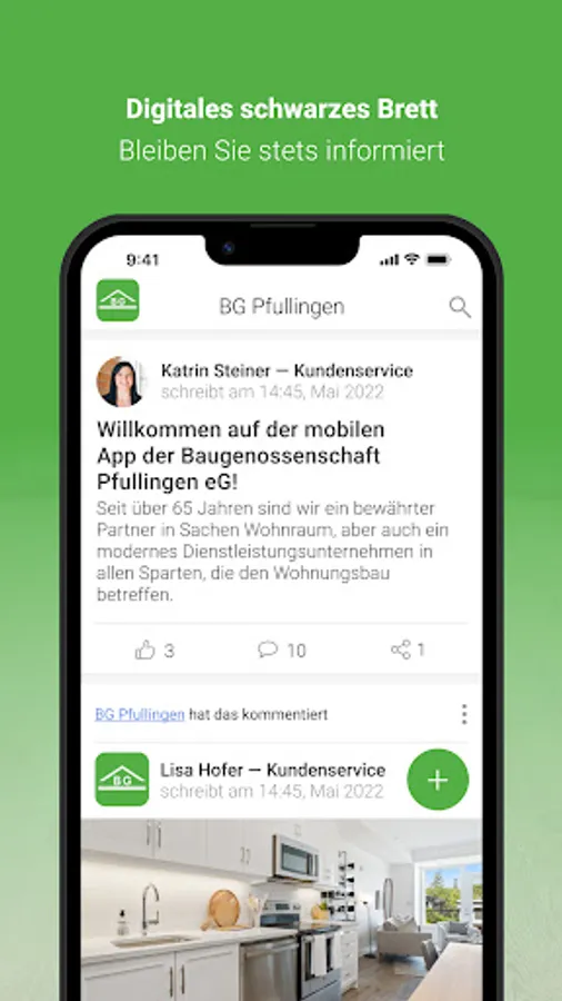 - Transparent: For us, documentation is “half the battle”. With the BG Pfullingen app you get all the important information about your property directly on the bulletin board and can comment on it.