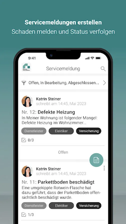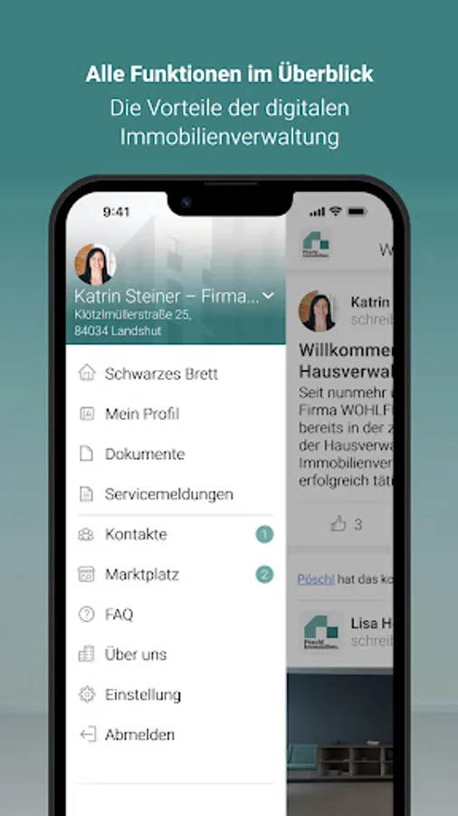 As a customer of Sebastian Pöschl Immobilienverwaltung & Consulting, you benefit from a particularly innovative customer service that offers you a lot of freedom. With the Pöschl app, you can report concerns and damage to us around the clock, including photo documentation, via smartphone. In addition, we provide you with a digital document folder with important documents for your property. We use the digital bulletin board to proactively provide push notifications about important information about the property entrusted to us.