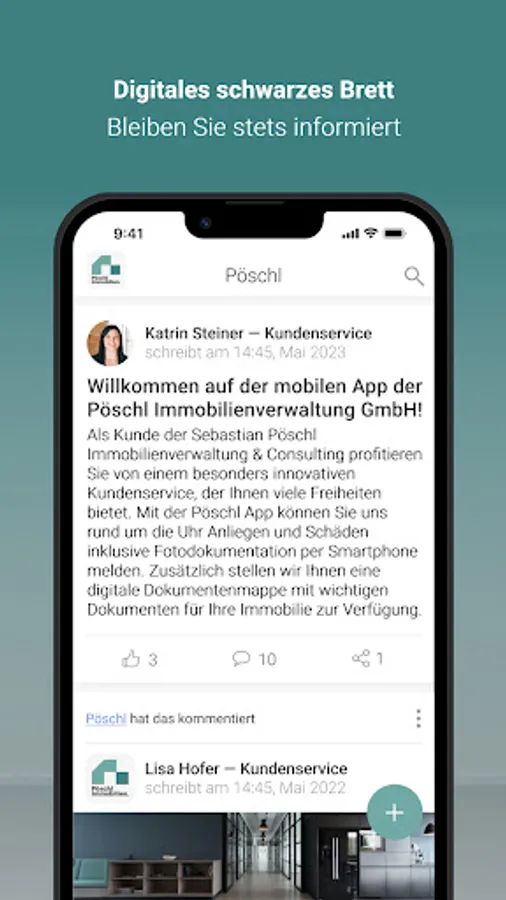 - Transparent: For us, documentation is “half the battle”. With the Pöschl app, you receive all the important information about your property directly on the bulletin board and can comment on it.