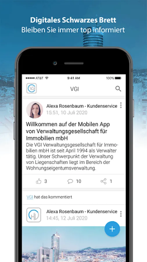 With the VGI app we offer our customers a lot of freedom. Issues and damage, including photo documentation, can be conveniently reported to us around the clock via the smartphone. In addition, we provide a digital document folder with important documents about the property. Via the digital bulletin board, we proactively provide push messages about important information about the real estate entrusted to us.