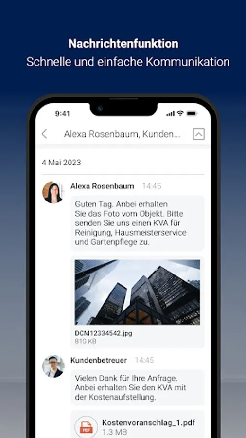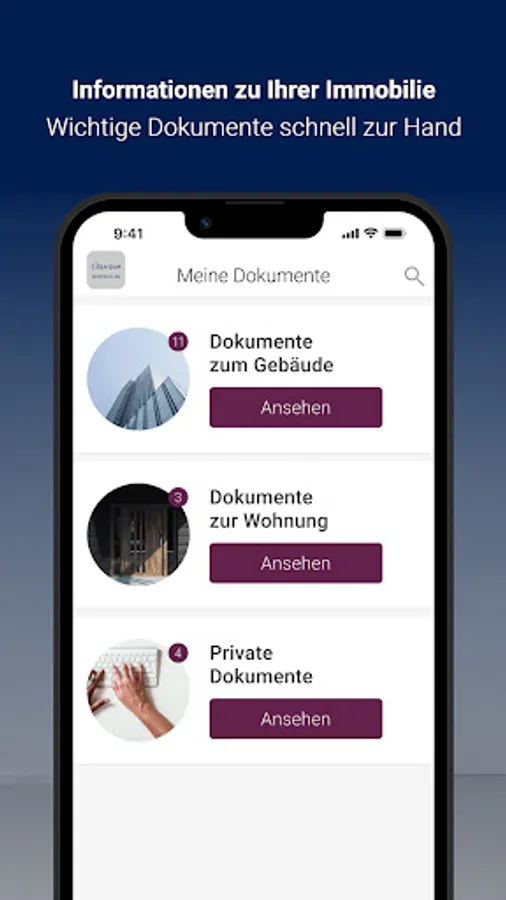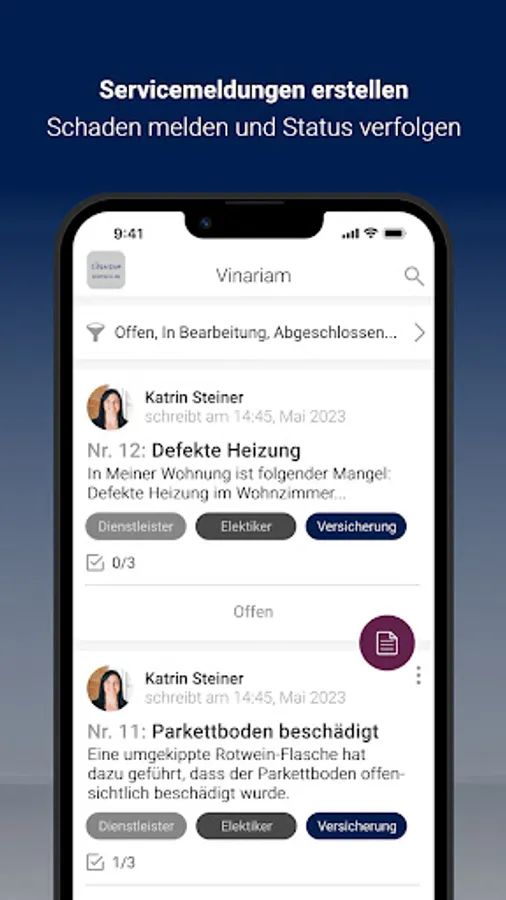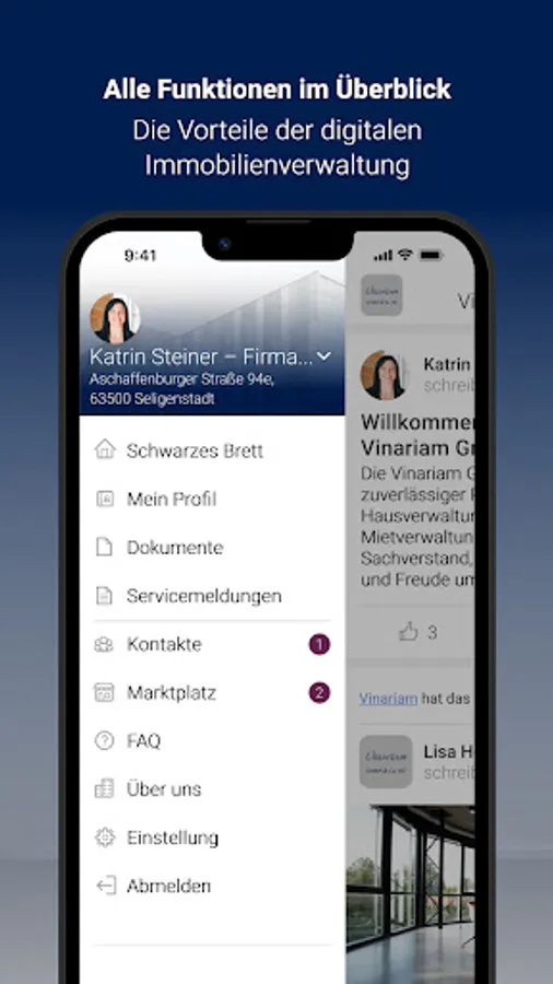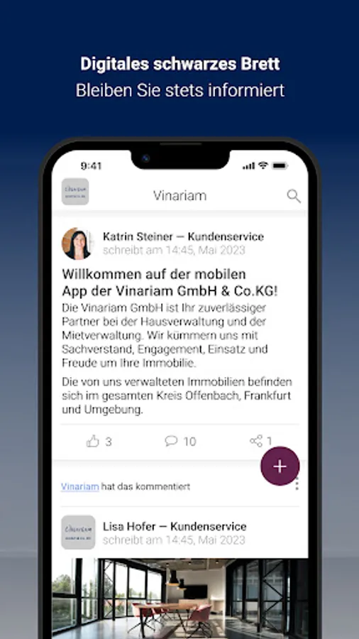 As a customer of Vinariam GmbH & Co. KG, you benefit from a particularly innovative customer service in property management, which offers you a lot of freedom. With the Vinariam app, you can report concerns and damage to us around the clock, including photo documentation, via smartphone. In addition, we provide you with a digital document folder with important documents for your property. We use the digital bulletin board to proactively provide push notifications about important information about the property that Vinariam GmbH & Co. KG manages.