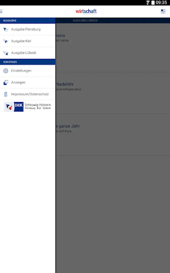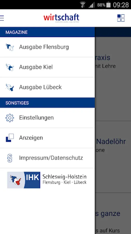 Economy between North and Baltic Sea is the journal of Chambers of Commerce Flensburg, Kiel and Lübeck. The distribution of the magazine covers the districts of CCIs Flensburg, Kiel and Lübeck and thus the entire state of Schleswig-Holstein. The book will be published in three regional editions, which have a section covering.