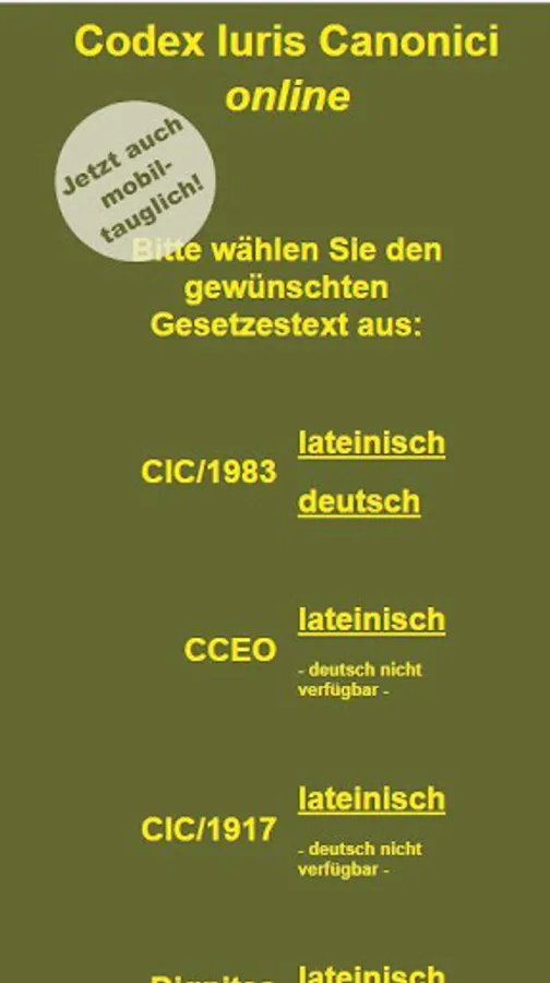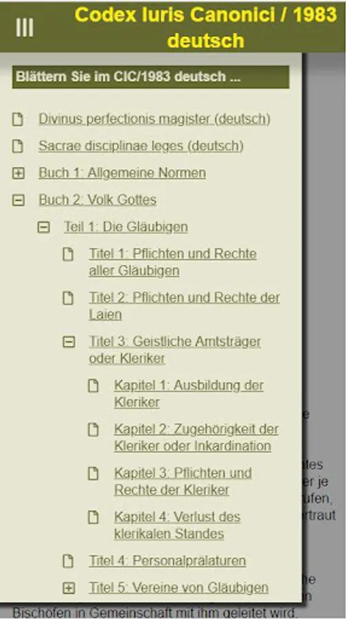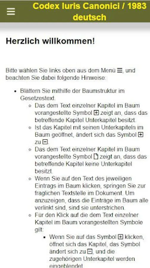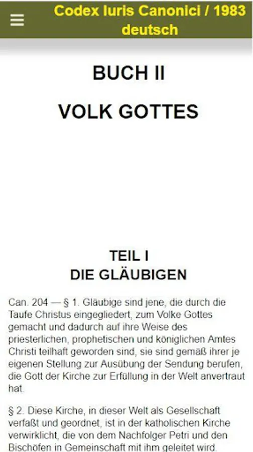 This app provides mobile access to the CIC / 1983 (Latin and German), CCEO (Latin), CIC / 1917 (Latin), Dignitas connubii (Latin and German) and Pastor bonus (Latin and German). It allows a scrolling and a full-text search in the legal texts. The functionality corresponds to access via browser to https://www.codex-iuris-canonici.de. Updates to the site are therefore reflected one to one in the app, and an active internet connection is required for the operation of the app. There is no offline functionality.