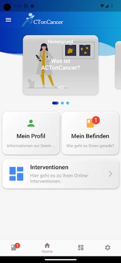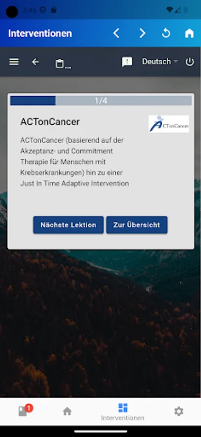 ACTonCancer is an individualized, psychological self-help program based on the principles of acceptance and commitment therapy. Content can be selected in coordination with the daily well-being.