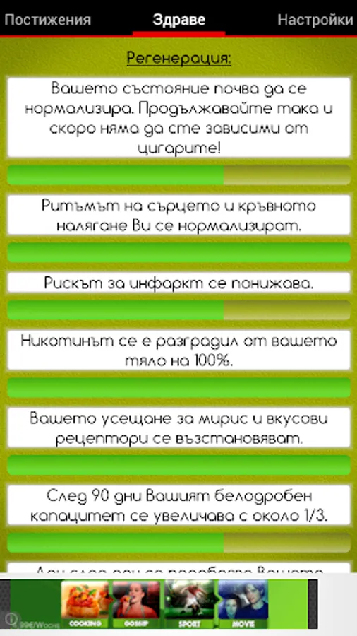 Stop Cigarettes is an application for your mobile phone that helps you to get rid of this bad habit - smoking. It assists your decision to stop smoking by counting the days you no longer smoke, calculates your money saved on cigarettes, and briefly shows you how your body is recovering. Stop Cigarettes stimulates you and your endeavor on the road to a healthier life! When you feel your cigarette hunger bothers you, the Crisis button will save you with quick tips. We are looking forward to this application to help many people in Bulgaria! To help them, please use the "Share" button!