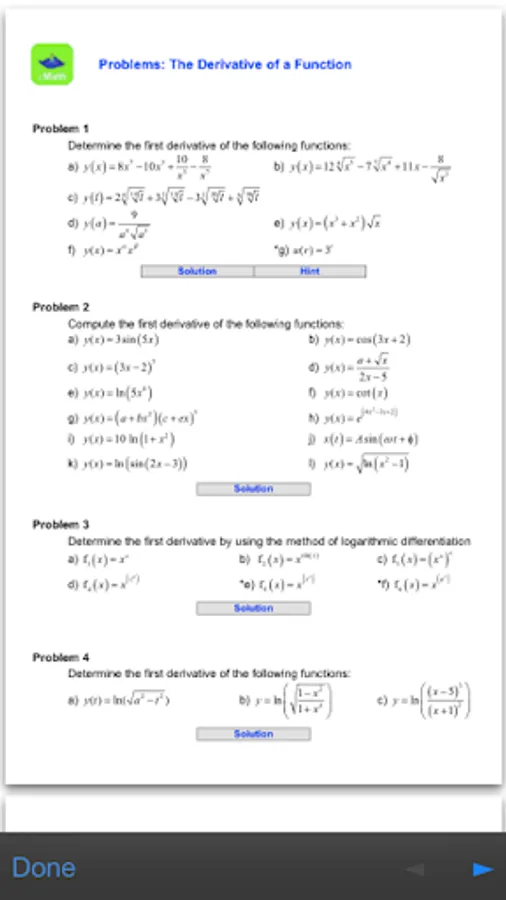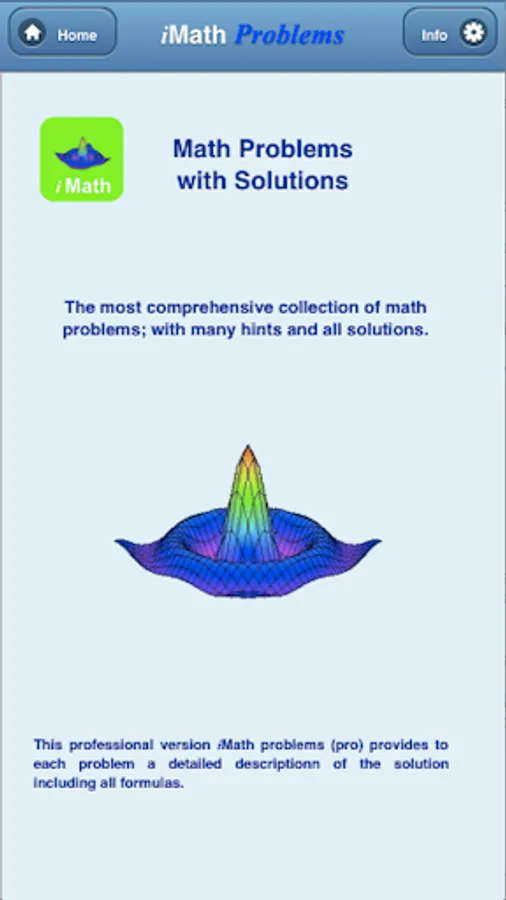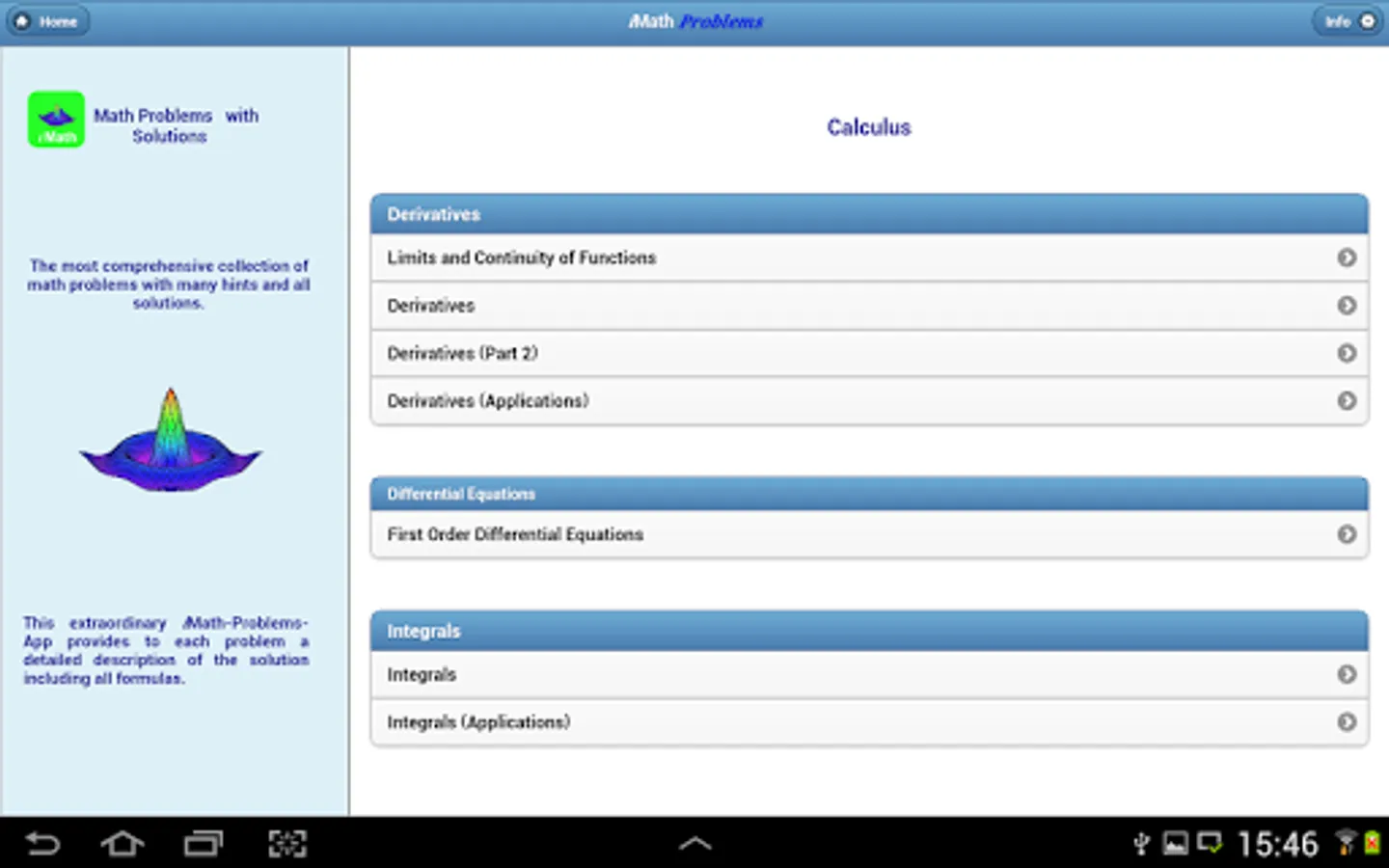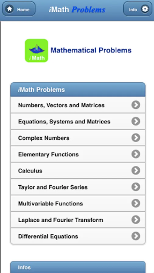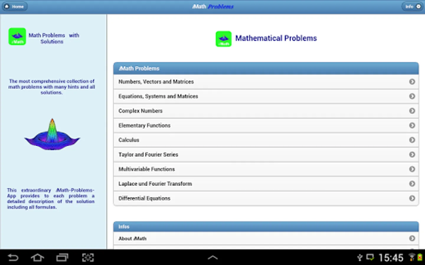 The app includes problems on the topics of Numbers, Vectors and Matrices, Complex Numbers. Besides Equations, Systems and Inequalities, Systems of Linear Equations also Elementary Functions, and Calculus is investigated. Several worksheets are related on Taylor and Fourier Series, Multivariable Functions, and Laplace and Fourier Transform. Finally, extended problems on Ordinary and Partial Differential Equations are investigated.