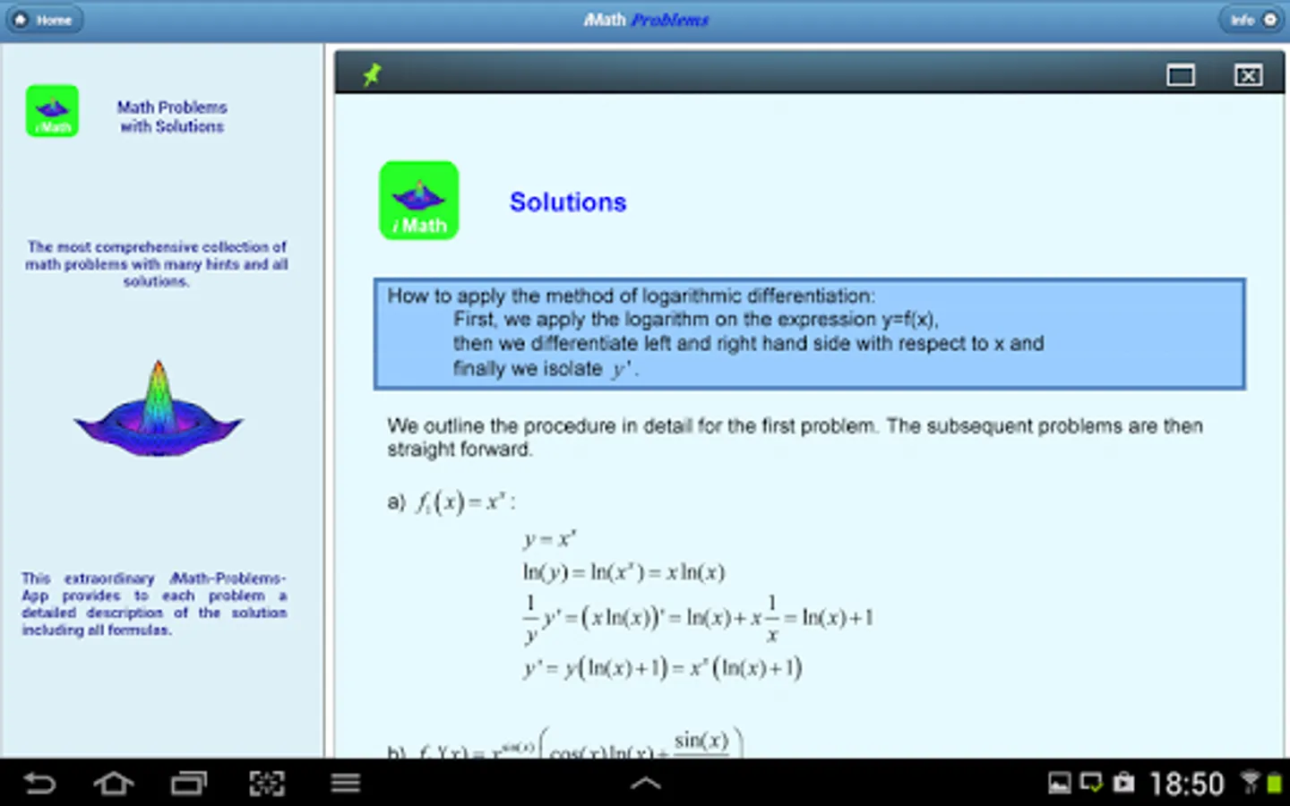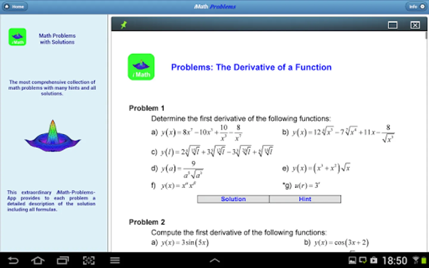 iMath is the most comprehensive collection of mathematical problems with many hints and all detailed solutions. This educational math app can be used excellently from students for their exam preparation and for self-studies.