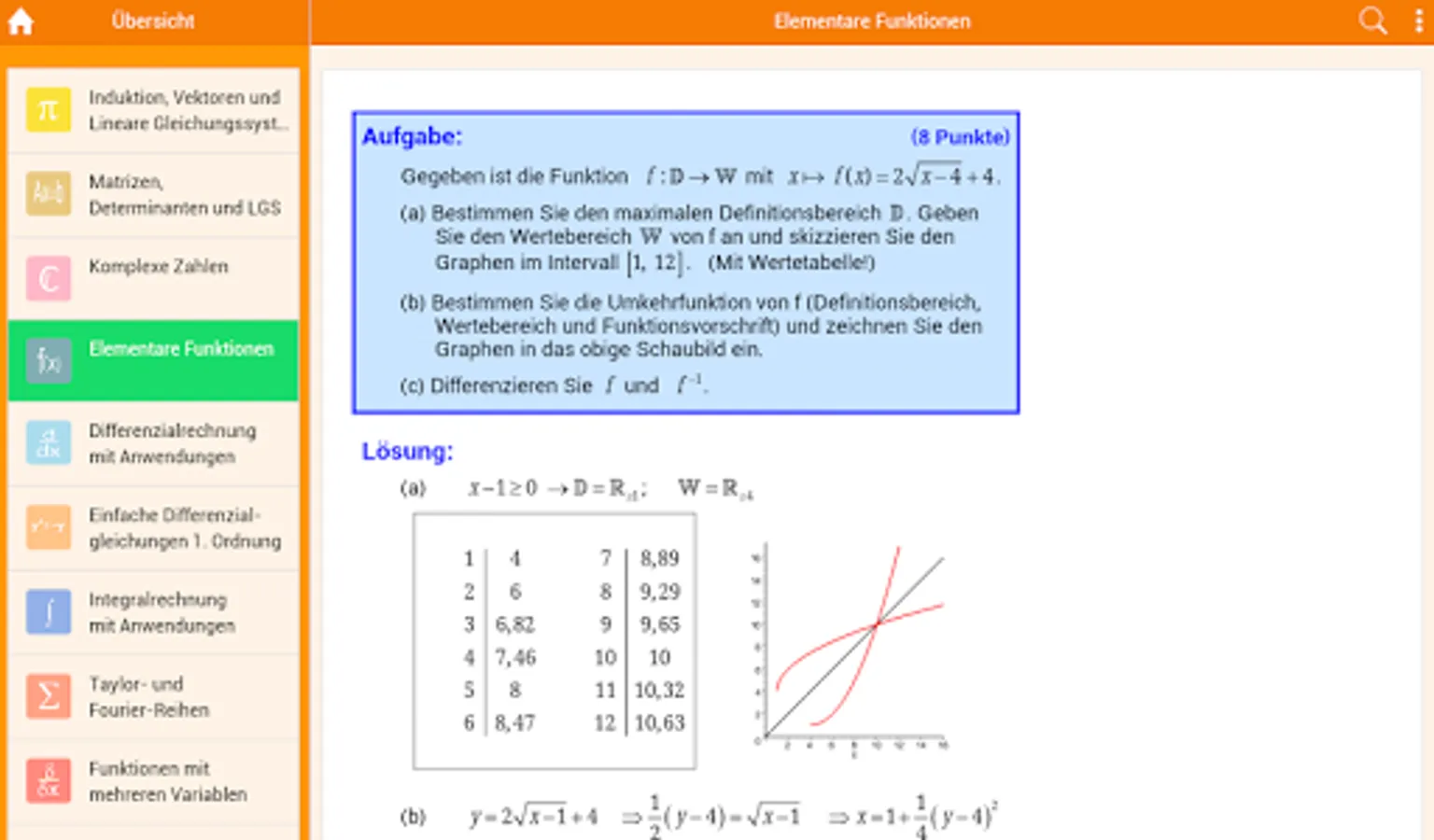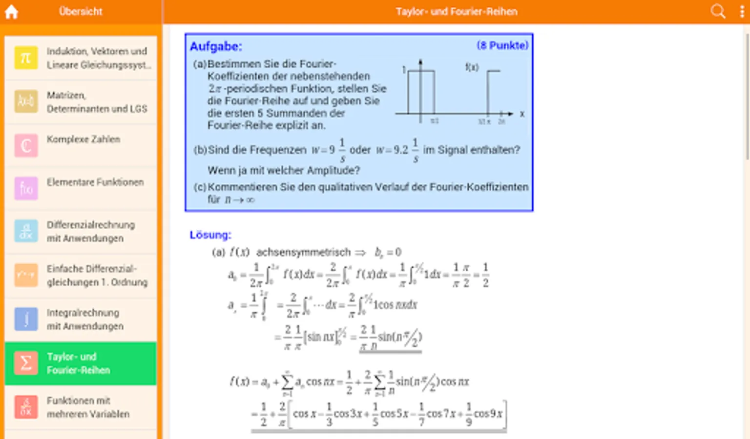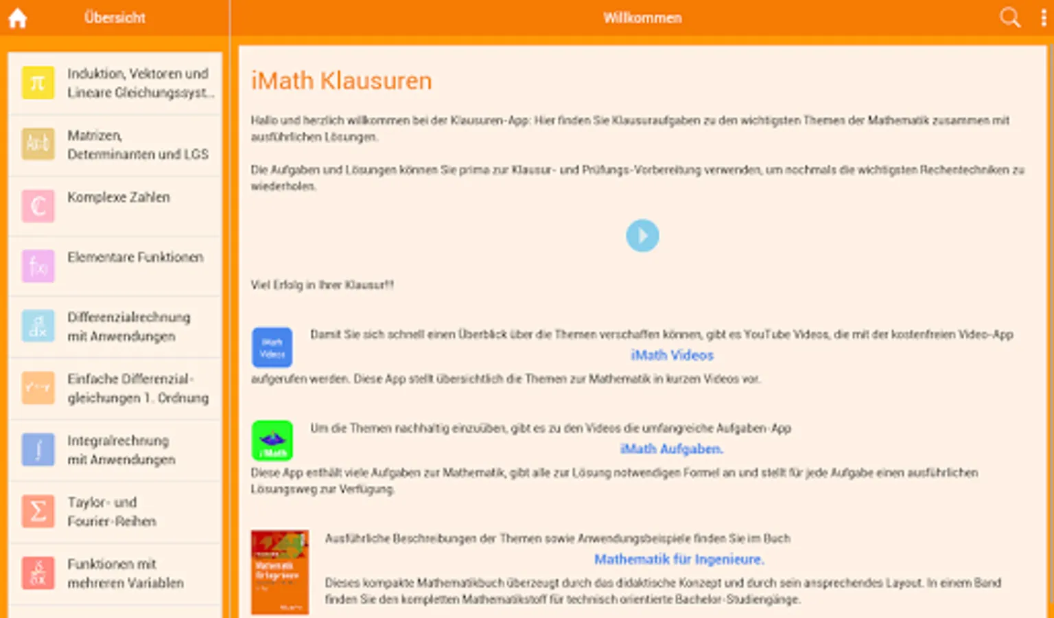 Here you can find exam questions on the major issues of engineering mathematics, along with detailed solutions. The tasks and solutions can thus be used to fine Klausur- and exam preparation in order again to recall the main computational techniques. This app is the perfect complement to the iMath-Tasks app and iMath video app.