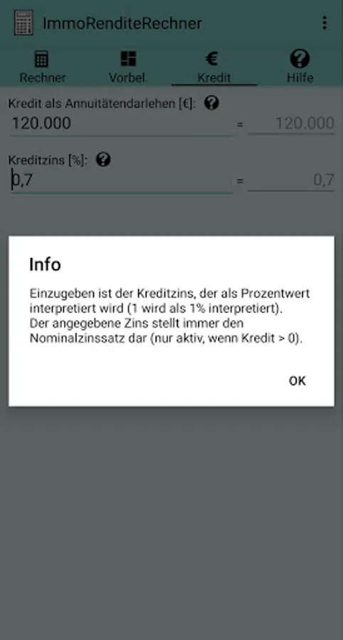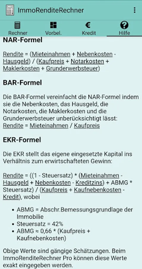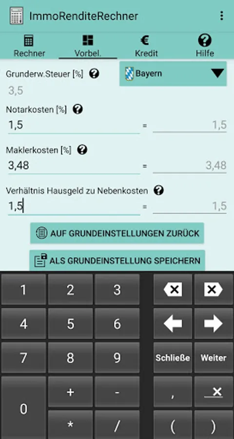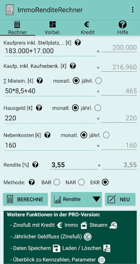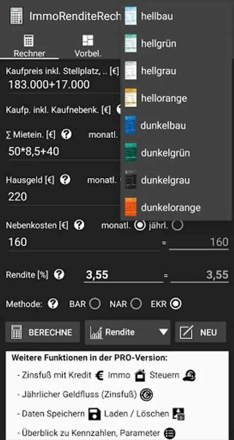 Special features of this app are a color customization, several calculation targets (return, rental income, purchase price) and an integrated "calculator function" for all numeric input fields. If, for example, no rent is specified, the total rent can be determined using the apartment size, the estimated rent / sqm and the estimated parking space rent using the "calculator function": e.g. 50.5 * 9.2 + 40. The ImmoRenditeRechner itself does not use any other services and can also be used offline.