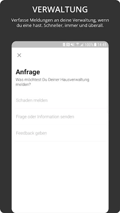 • NOTIFY ANSWERS: Send direct, fast and anytime claims, questions, etc. to your administration! Of course, you can also send photos so that fixing the damage is much easier.