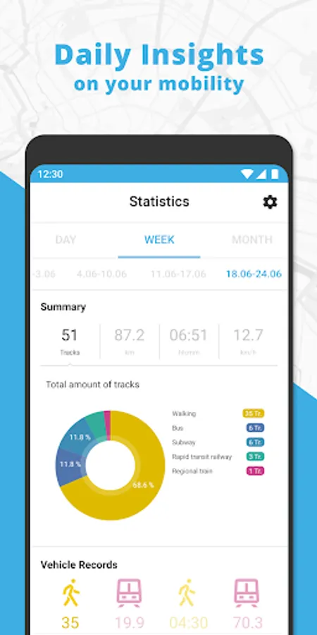 With the calendar you can review, where you've been and how you got there. With the map you get an overview over every day. Through your personal statistics you find out which transport means were the fastest for you and which you used most often.